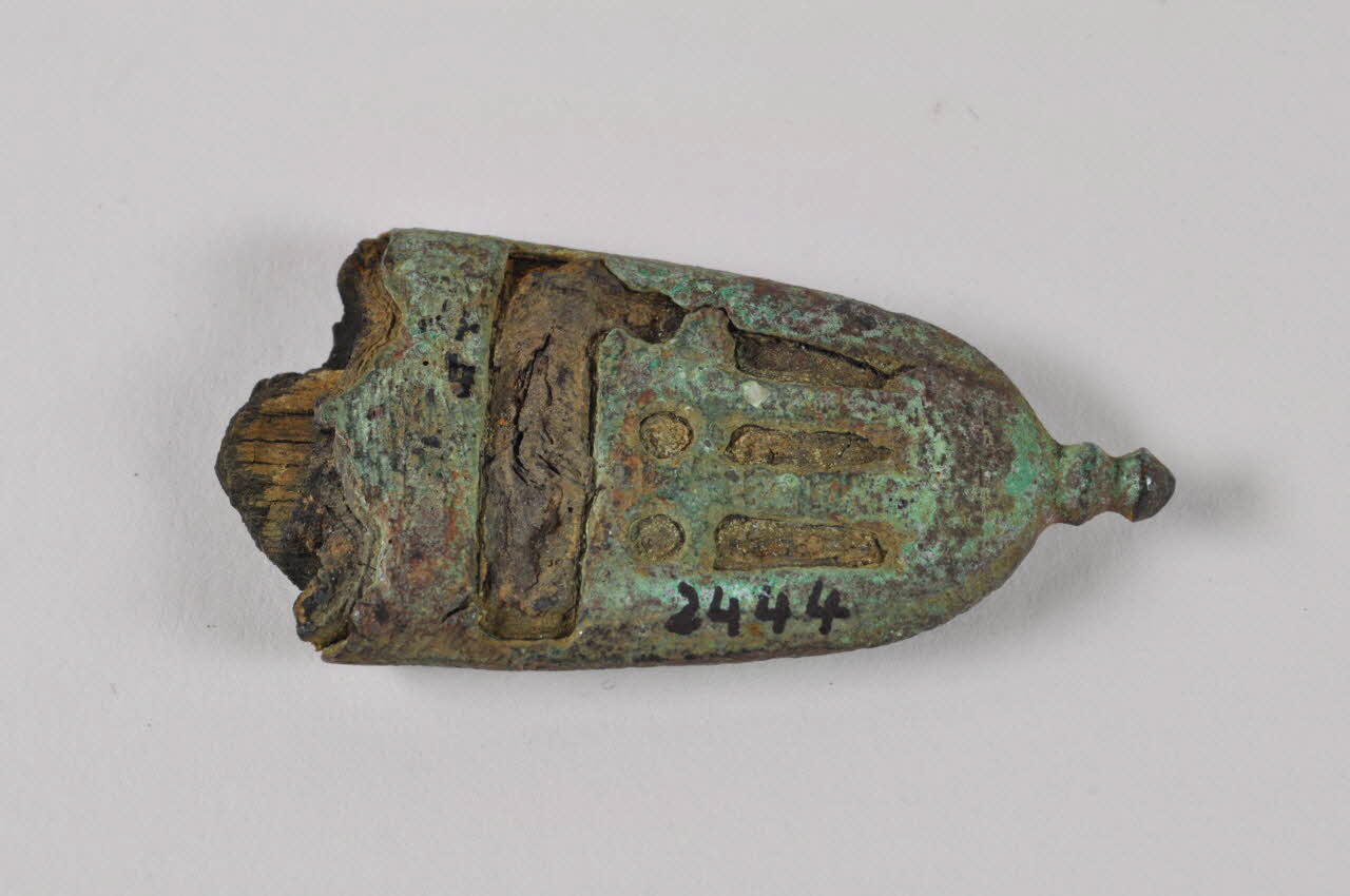 Pointe de fourreau de forme semi-ovale. Une lame de bois servant d'armature est visible. Un décor géométrique est ajouré sur les deux faces.Matériaux et techniques