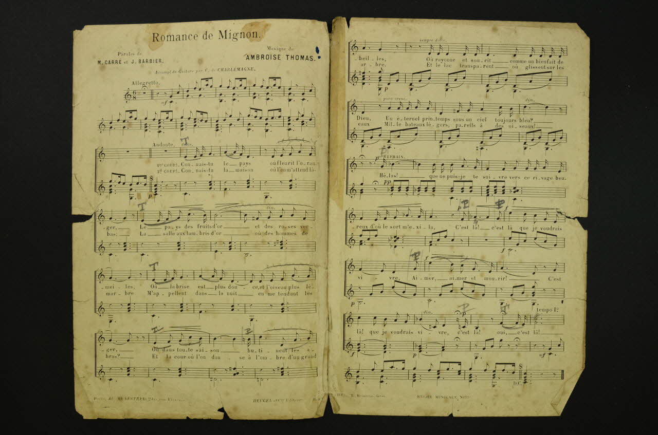 Musique & Instruments // [...] (A l'encre bleue en partie inférieure de la première page.)Au Ménestrel // [...] (A l'enre bleue de forme rectangulaire en partie inférieure de la première page.)Matériaux et techniques