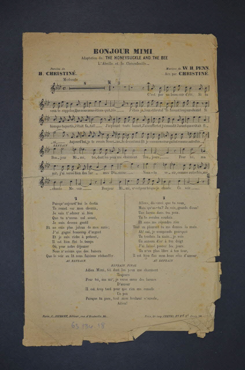 Au recto, le portrait photographique en médaillon de Henri Christiné, sur fond d'arabesques, accompagnant les inscriptions qui renseignent le titre de la chanson, le nom des auteurs, des artistes et de l'éditeur. Au verso, partition et paroles de la chanson.Décor