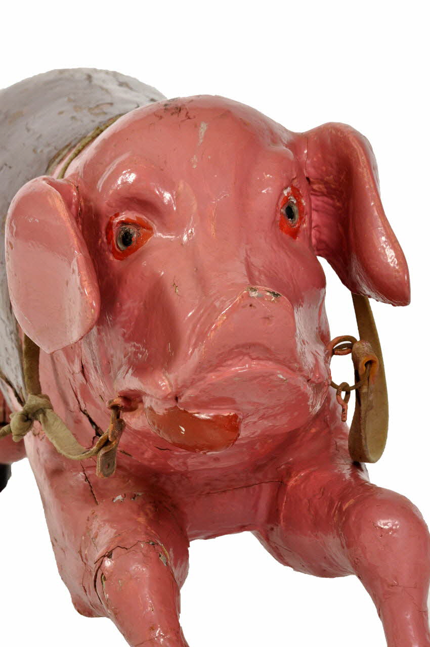 Cochon sauteur à quatre pattes, tirant la langue appartenant au manège Campion. Il est sculpté, peint en rose et possède des yeux en verre teintés en bleu.