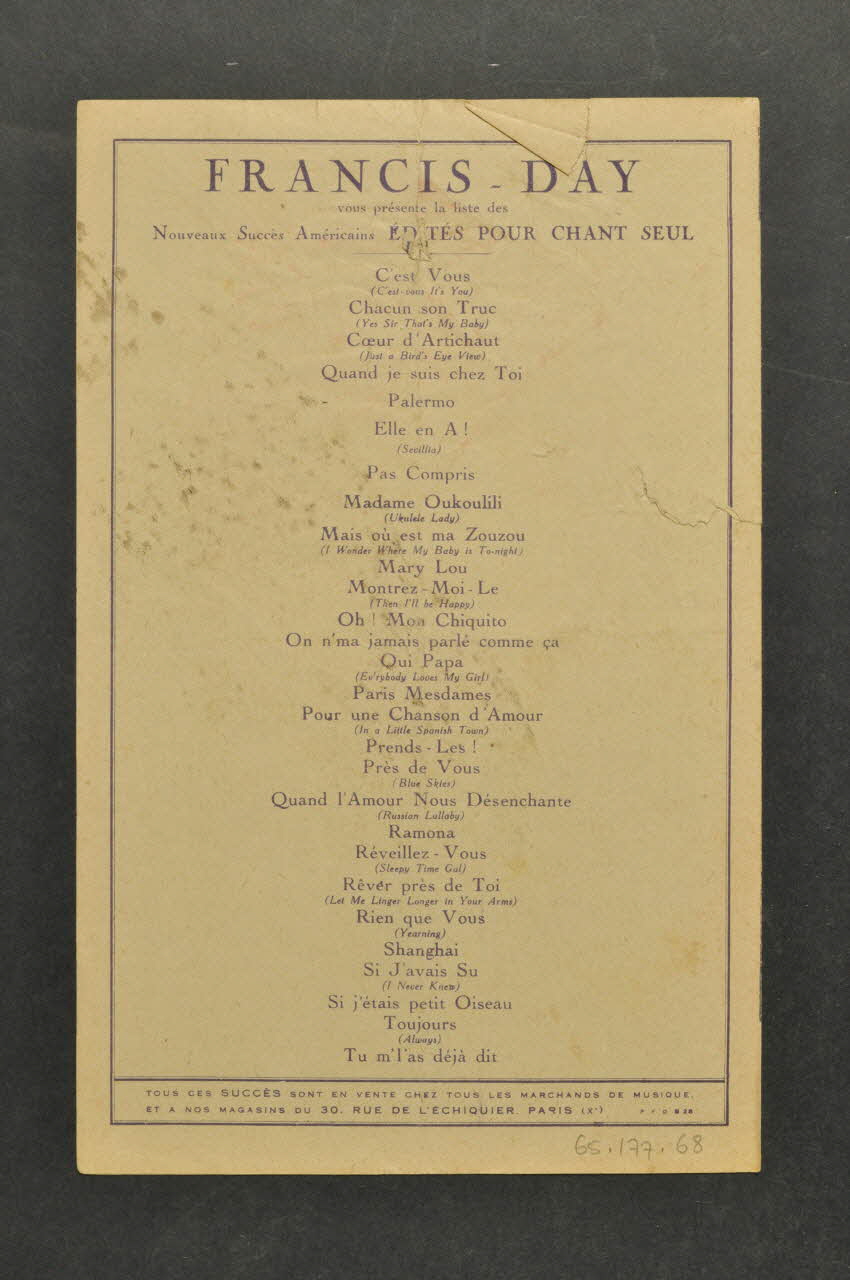 Des inscriptions renseignent le titre, les auteurs, les exécutants et l'éditeur. A l'intérieur, partition et paroles de la chanson. Au dos, liste d'autres partitions publiées par l'éditeur.Décor