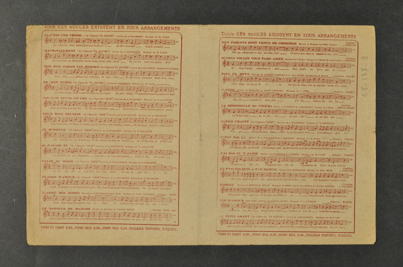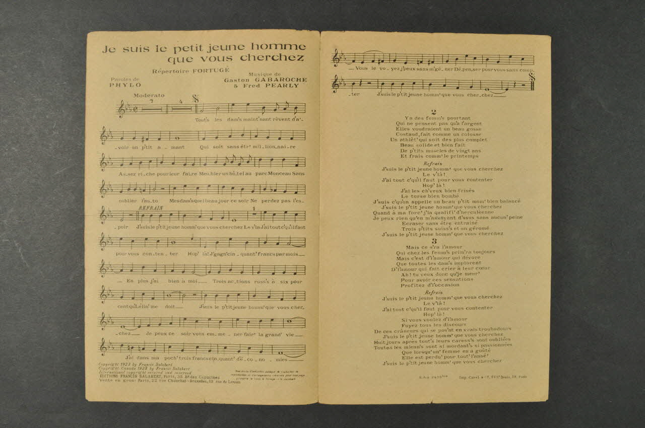 Les inscriptions renseignent le titre de la chanson, le nom des auteurs, de l'artiste et de l'éditeur. A l'intérieur, partitions et paroles de la chanson. Au dos, liste d?autres partitions publiées par l?éditeur.Décor