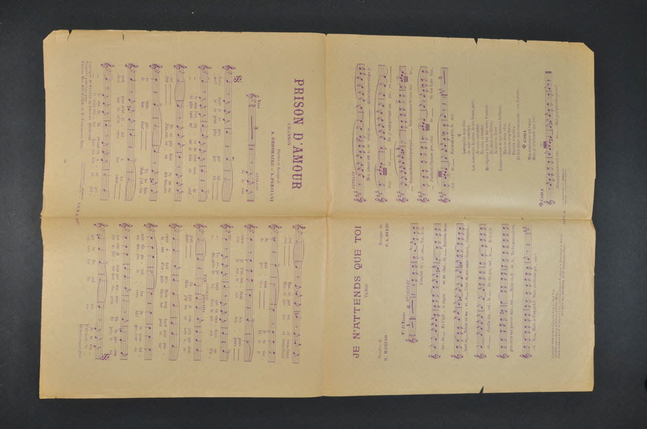 Feuillet rectangulaire en papier industriel imprimé à l'encre mauve. Sur la couverture, un portrait photographique de Lys Gauty.