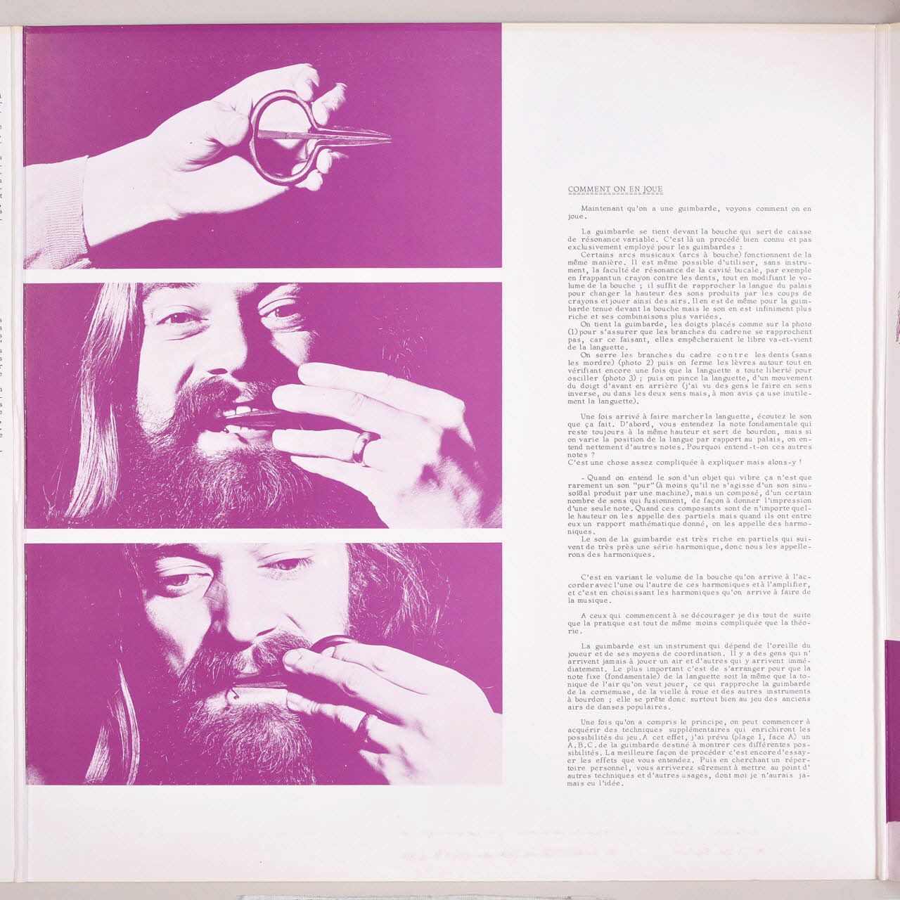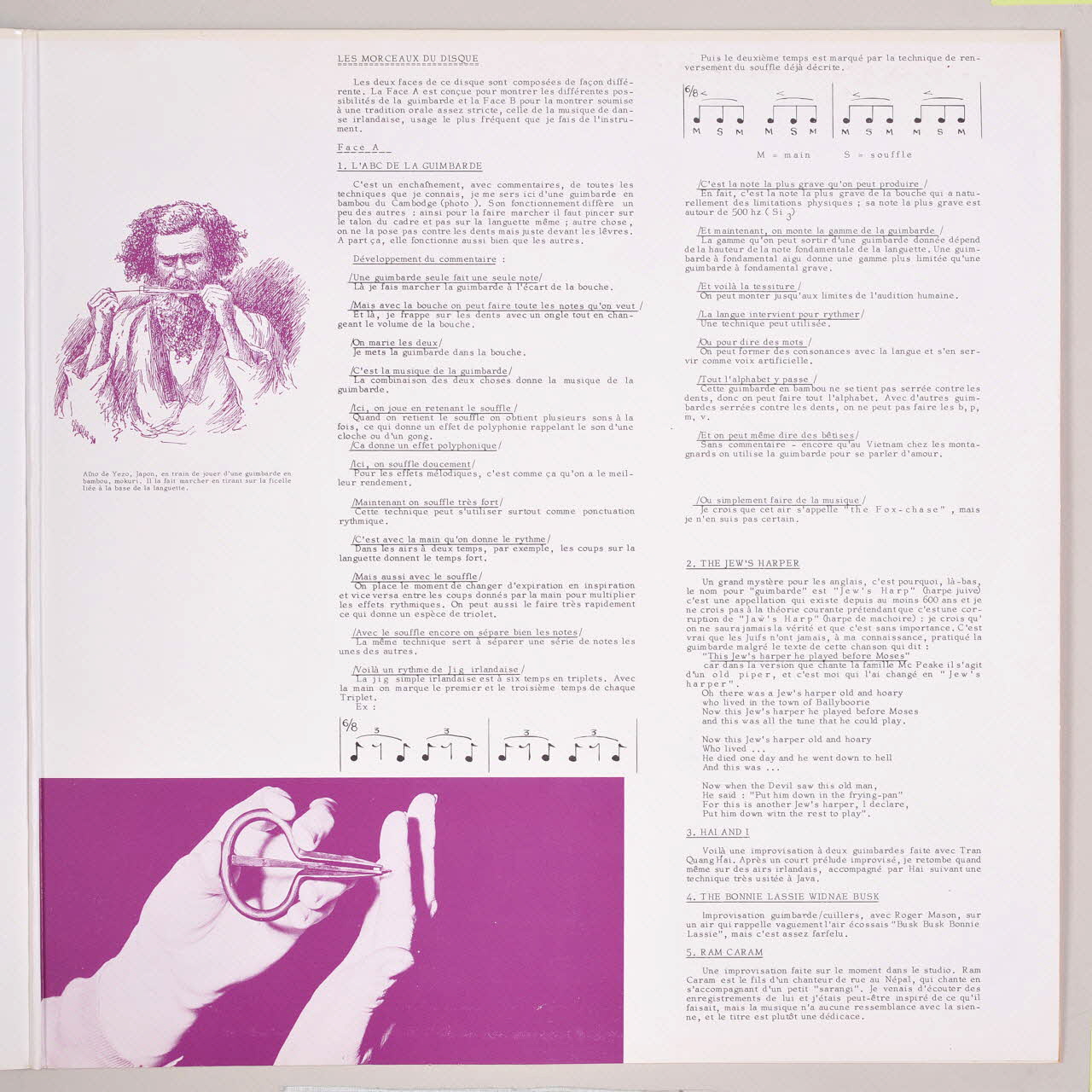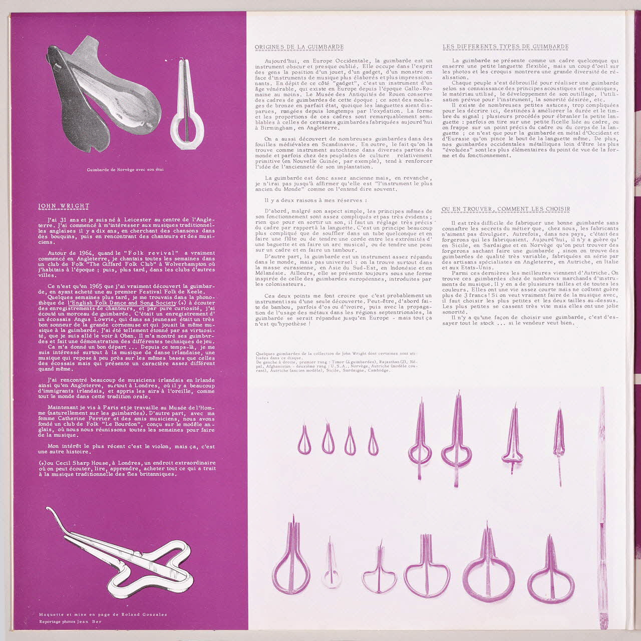 Au verso de la pochette, une photographie d'une guimbarde. A l'intérieur de la pochette, des textes explicatifs illustrés de dessins et de photographies. Des inscriptions sur les deux faces de la pochette et sur l'étiquette orange du disque renseignent les titres et les exécutants de l'album.Décor