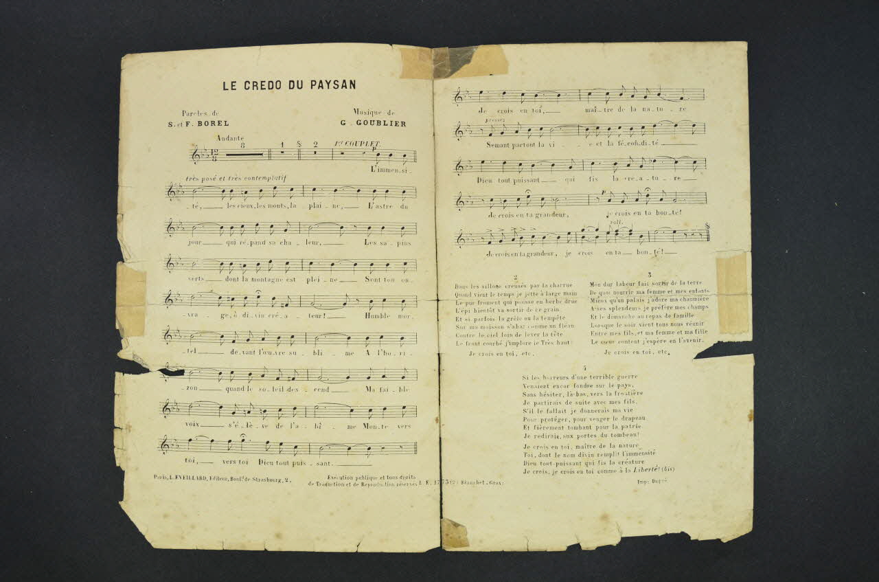 Feuillet rectangulaire en papier industriel imprimé à l'encre noire. Sur la couverture, un paysan priant dans un champ.