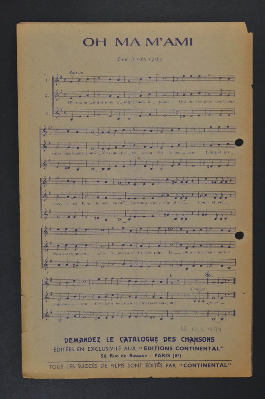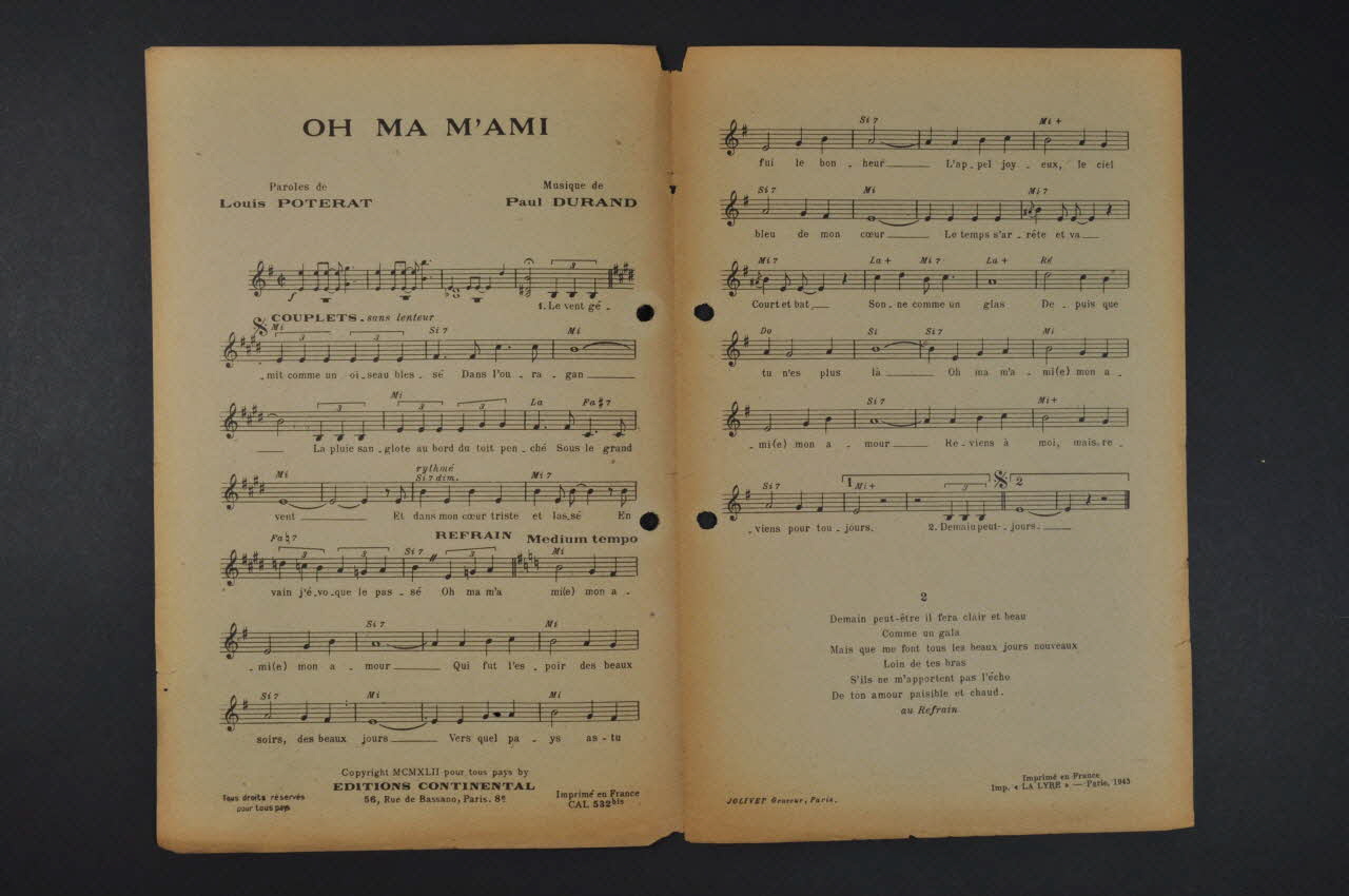Des inscriptions renseignent le titre, les auteurs, les exécutants et l'éditeur. A l'intérieur et au dos, la partition et paroles de la chanson. Le feuillet est perforé à deux reprises près de la tranche.Matériaux et techniques