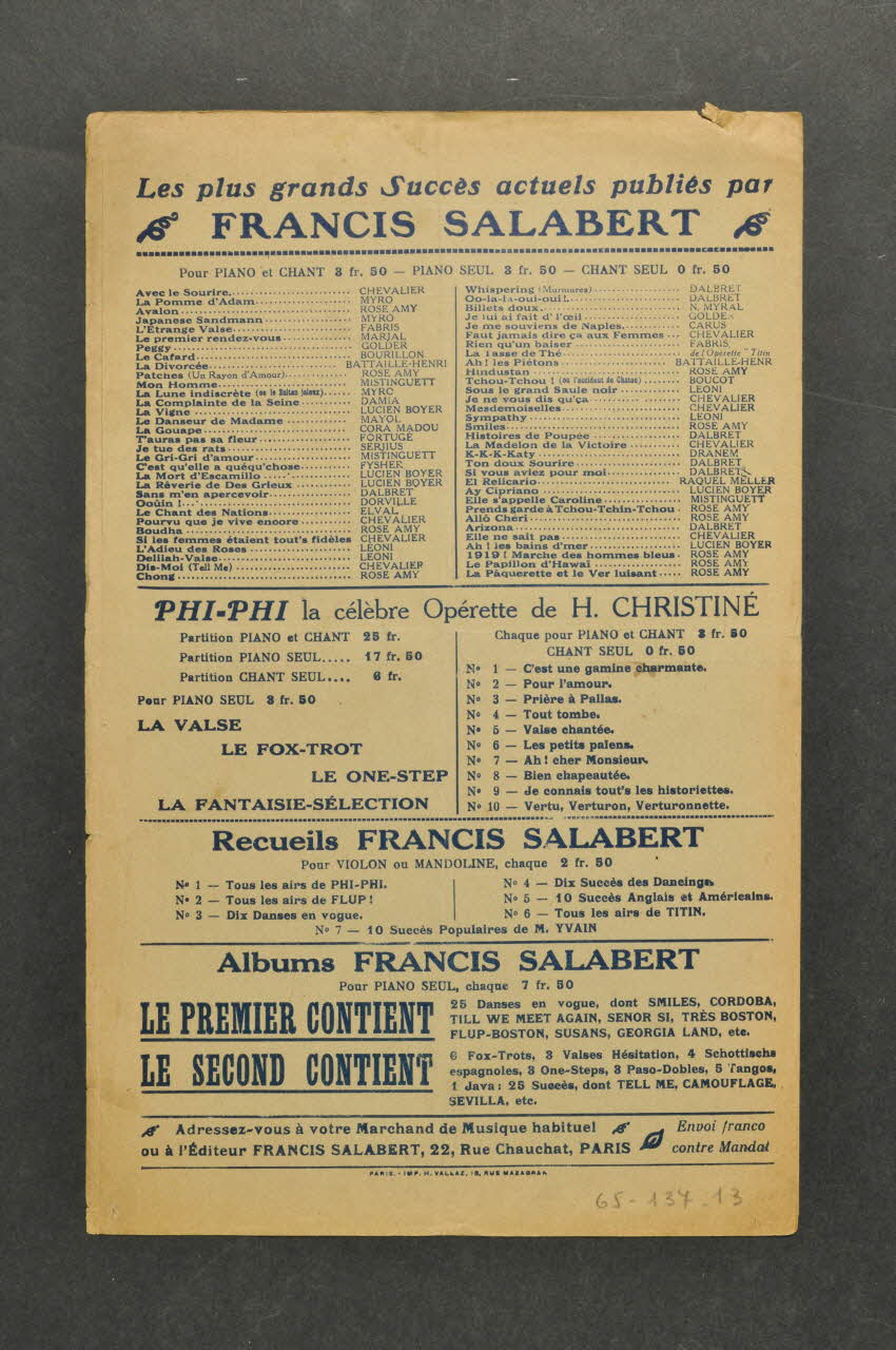 Des inscriptions renseignent le titre, les auteurs, les exécutants et l'éditeur. A l'intérieur, partition et paroles de la chanson. Au dos, liste d'autres partitions publiées par l'éditeur.Décor
