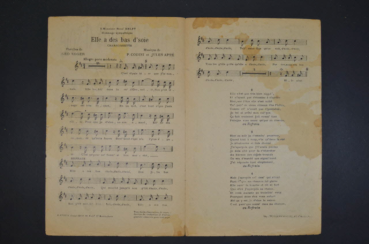 Des inscriptions renseignent le titre, les auteurs, les exécutants et l'éditeur. A l'intérieur, partition et paroles de la chanson. Au dos, liste d'autres partitions publiées par l'éditeur.Matériaux et techniques