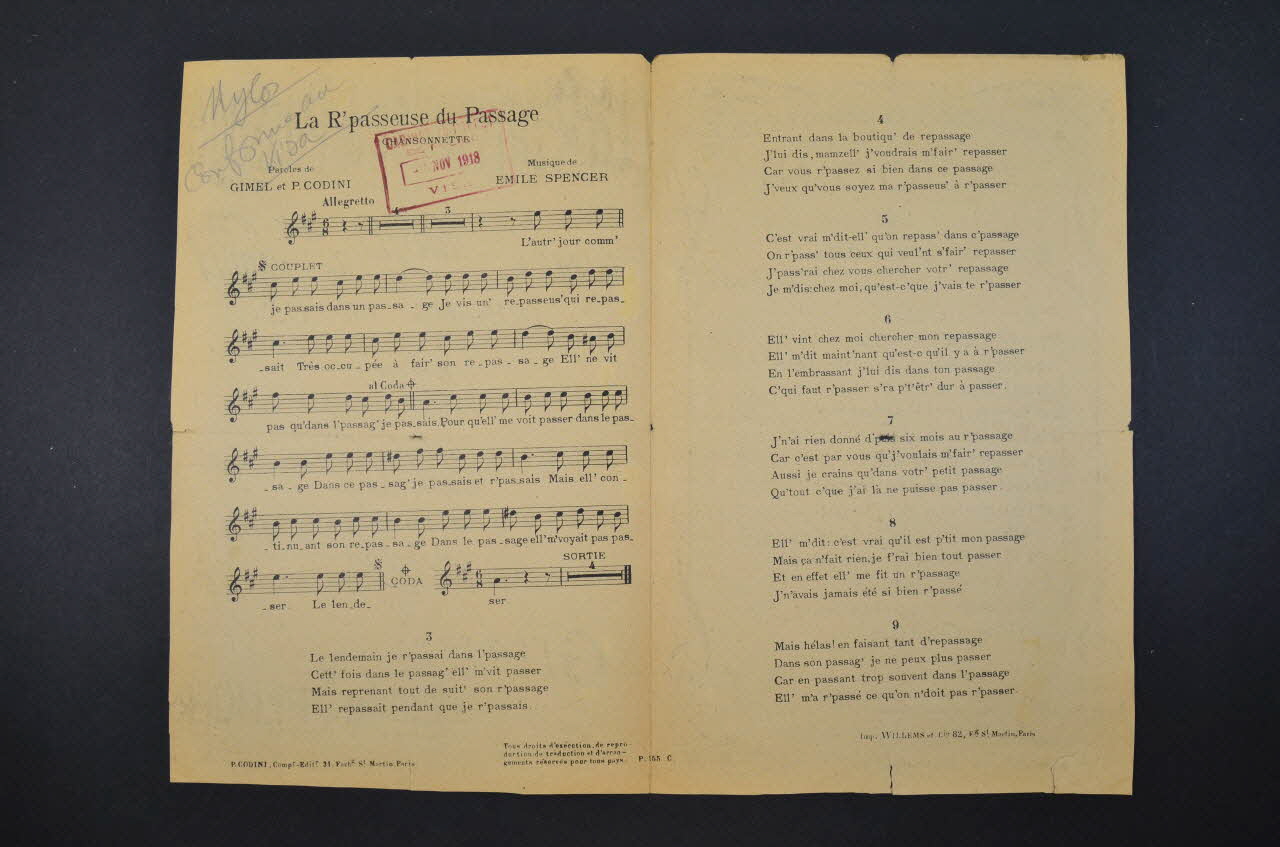 Feuillet rectangulaire en papier industriel imprimé. Le feuillet contient la partition et les paroles de la chanson. Au dos, publicité pour l'éditeur.Matériaux et techniques