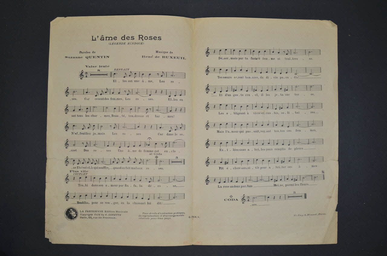 Sur la couverture, à gauche, le portrait photographique de Rouch ; en bas, à droite, le portrait photographique en médaillon de René de Bruxeuil dans un encadrement polylobé. Les inscriptions renseignent le titre de la chanson, le nom des auteurs, de l'artiste et de l'éditeur. A l'intérieur, partition et paroles de la chanson. Au dos, liste d'autres partitions publiées par l'éditeur.Décor