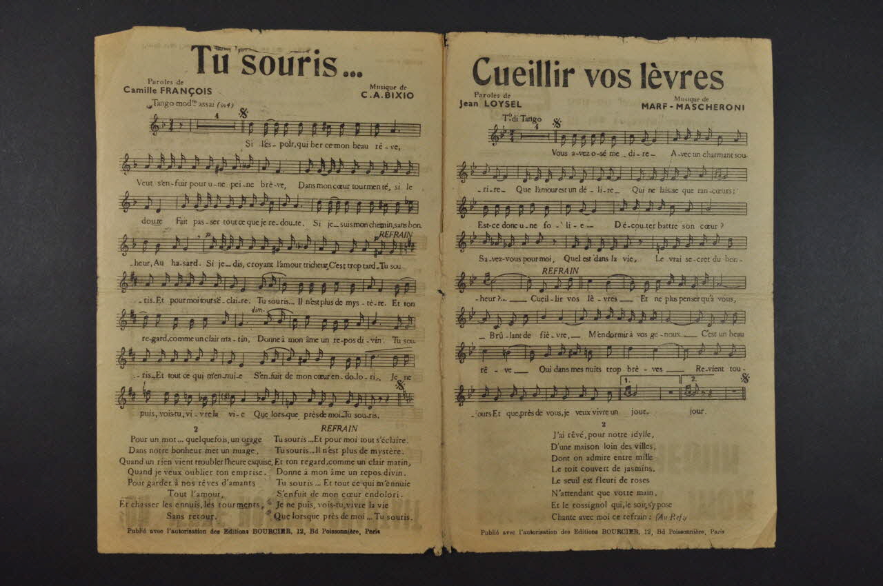 chanson, partition de musique, petit format, Cueillir vos lèvres, Sur mon chemin, Un jeune homme chantait, Tu souris