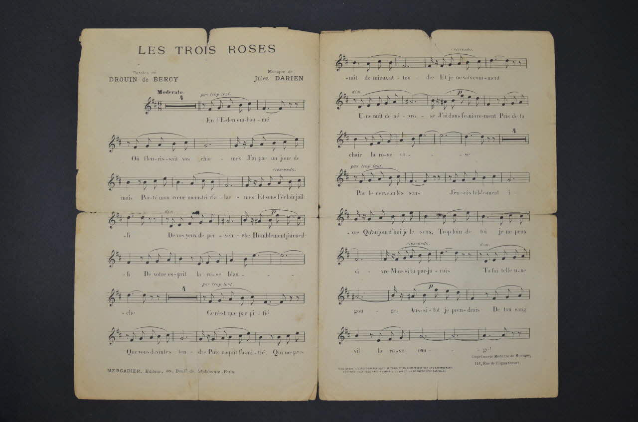 Sur la couverture, le portrait photographique en médaillon de Mercadier entouré de roses. Les inscriptions renseignent le titre de la chanson, le nom des auteurs, de l'artiste et de l'éditeur. A l'intérieur, partition et paroles de la chanson. Au dos, liste d'autres partitions publiées par l'éditeur.Décor