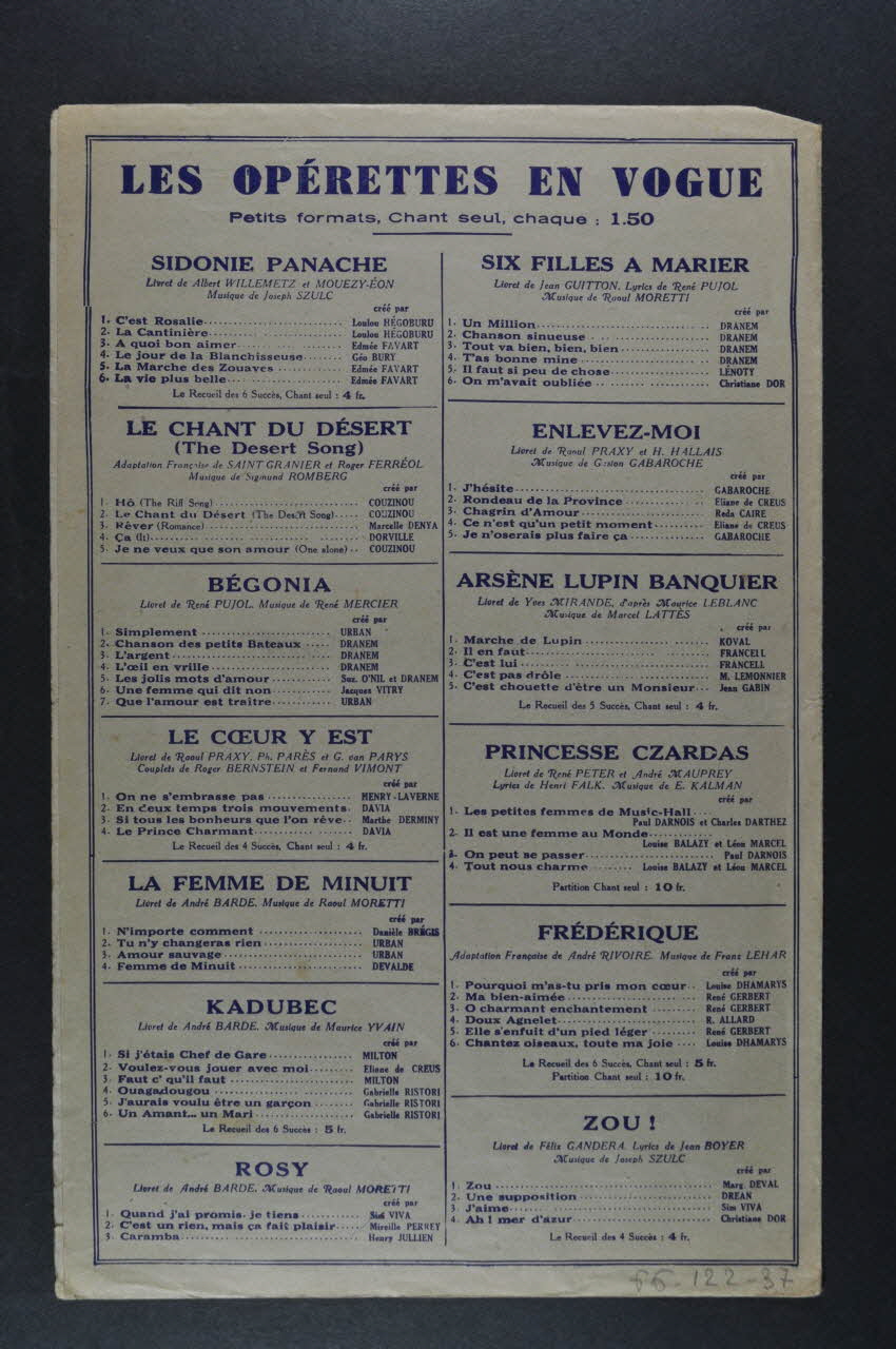 Des inscriptions renseignent le titre, les auteurs, les exécutants et l'éditeur. A l'intérieur, partition et paroles de la chanson. Au dos, liste d'autres partitions publiées par l'éditeur.Décor