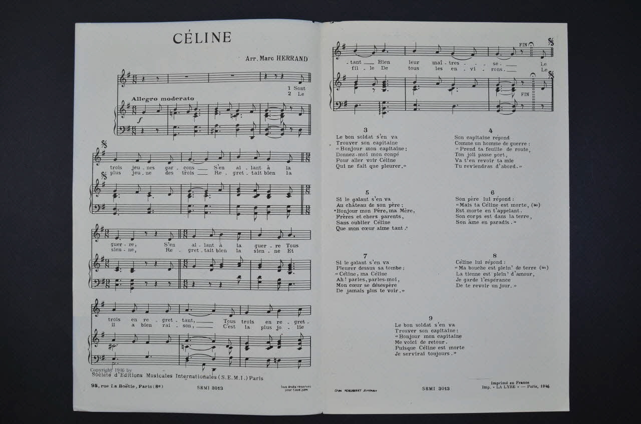 Les inscriptions précisent l'auteur de la chanson, les interprètes et l'éditeur du feuillet. L'intérieur comporte la partition et les paroles. Au dos, une liste d'autres titres disponibles chez le même éditeur.Décor