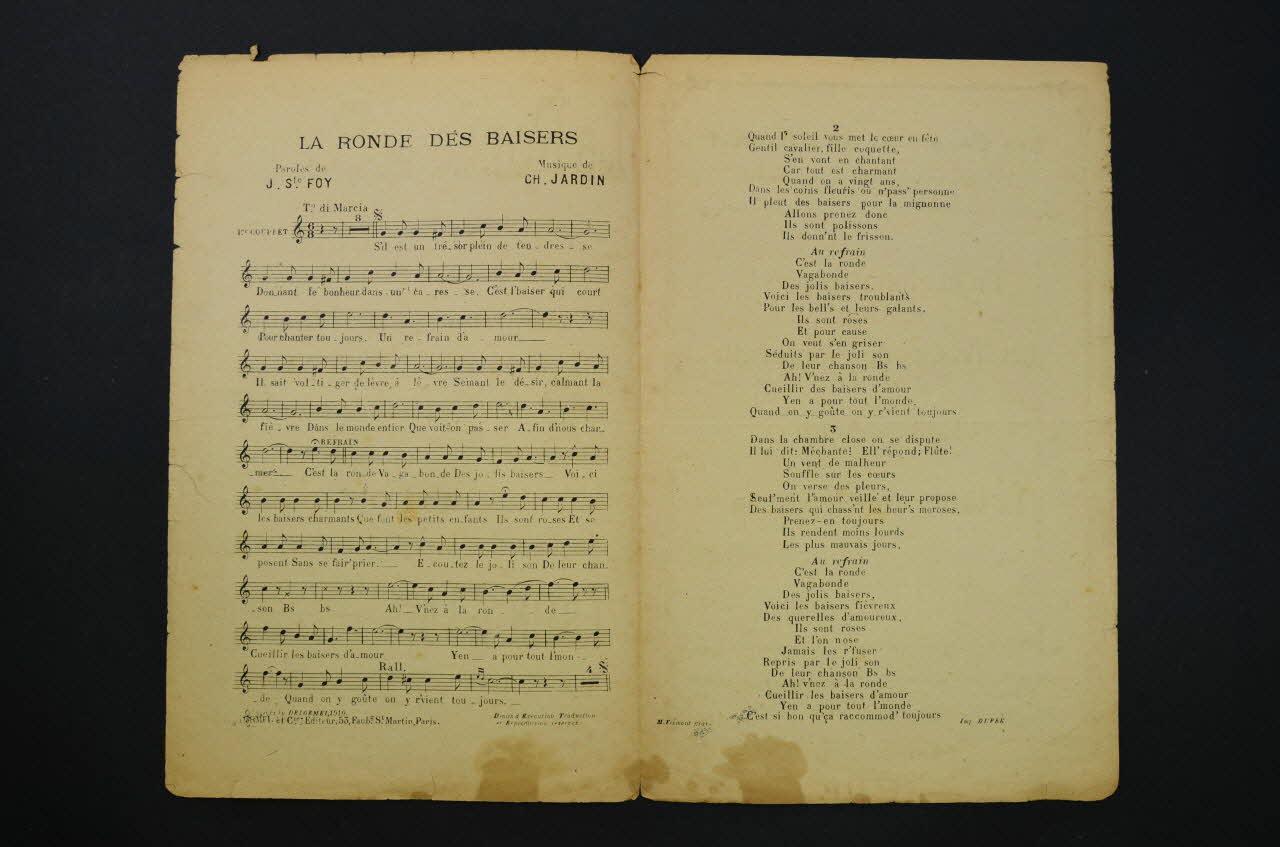 Les inscriptions renseignent le titre de la chanson, le nom des auteurs, de l'artiste et de l'éditeur. A l'intérieur, partitions et paroles de la chanson. Au dos, liste d?autres partitions publiées par l?éditeur.Décor