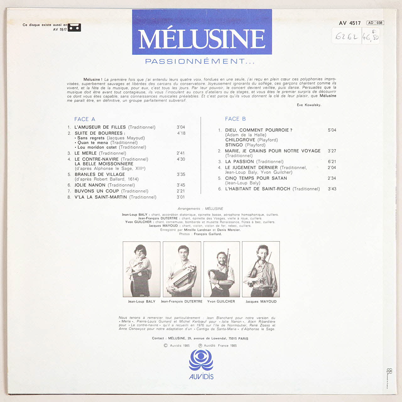 disque 33 tours, V'là la saint Martin, La belle moissonière, Le Jugement Dernier, Passionnément, Cinq temps pour Satan, La Passion, Childgrove, Le contre-navire, L'amuseur de filles, Jolie Nanon, Dieu comment pouroie, Marie je crains pour notre voyage, Stingo, Branles de village, Suite de bourrées, Buvons un coup, L'habitant de Saint-Roch, Le merle