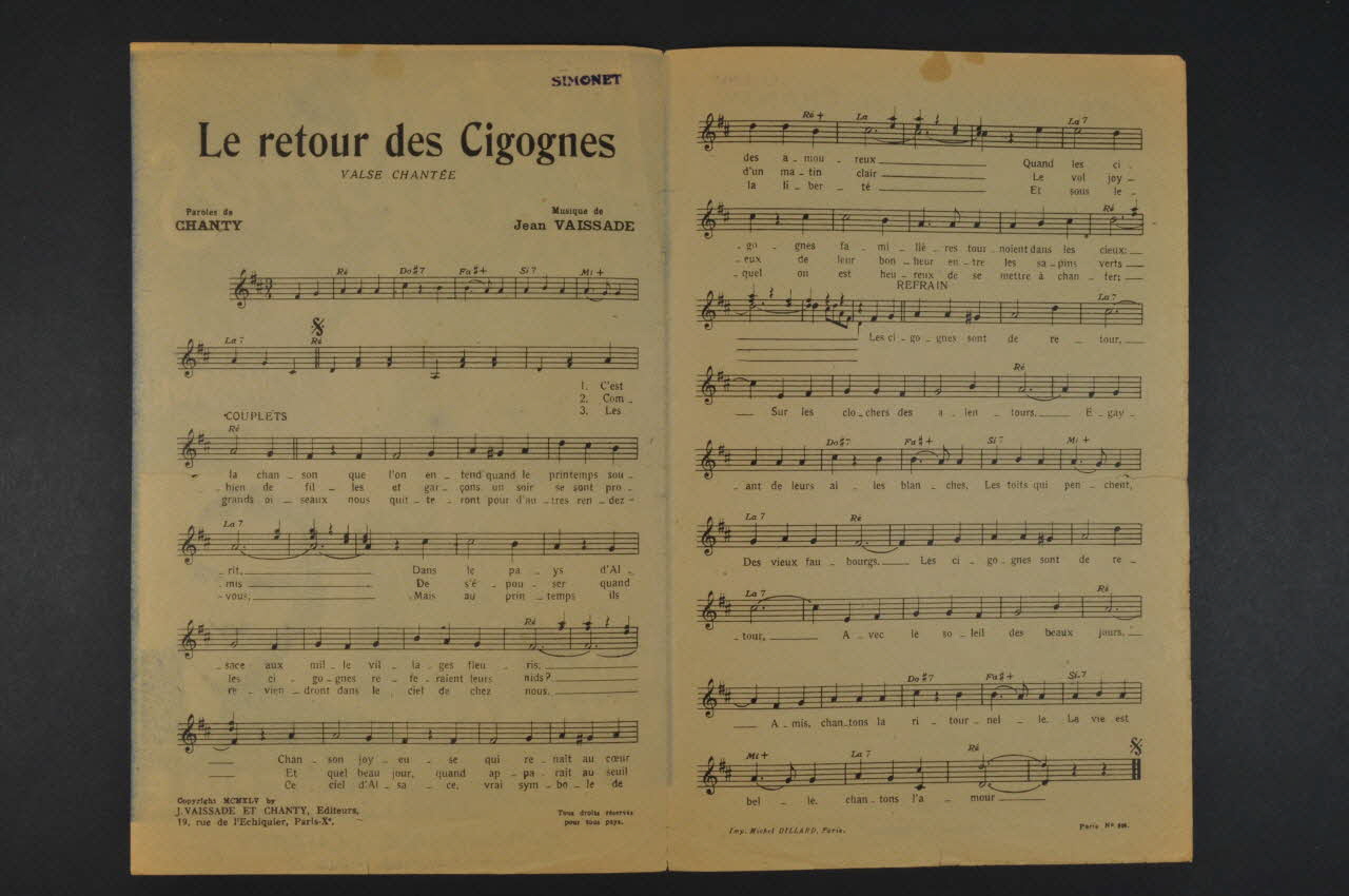 Les inscriptions renseignent le titre de la chanson, le nom des auteurs, de l'artiste et de l'éditeur. A l'intérieur, partitions et paroles de la chanson. Au dos, liste d?autres partitions publiées par l?éditeur.Décor