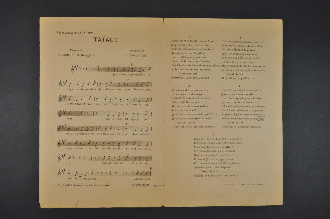 Des inscriptions renseignent le titre, les auteurs, les exécutants et l'éditeur. A l'intérieur, partition et paroles de la chanson. Au dos, liste d'autres partitions publiées par l'éditeur.Décor