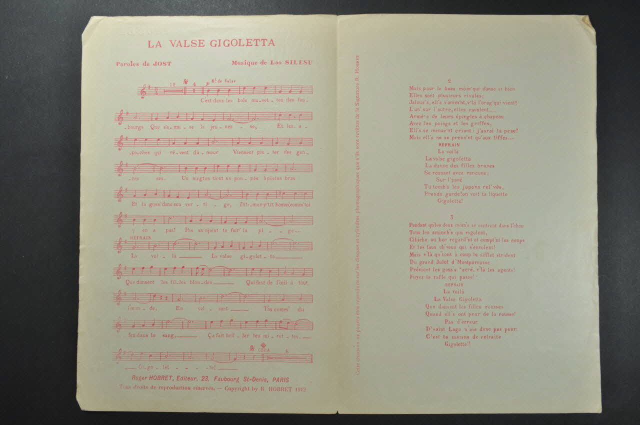 Les inscriptions renseignent le titre de la chanson, le nom des auteurs, de l'artiste et de l'éditeur. A l'intérieur, partitions et paroles de la chanson. Le dos est laissé vierge.Décor