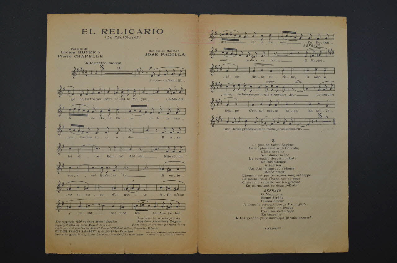Sur la couverture, les portraits photographiques en médaillon de Valiès et Jean Flor de part et d'autre de trois feuilles stylisées. Les inscriptions renseignent le titre de la chanson, le nom des auteurs, des artistes et de l'éditeur. A l'intérieur, partition et paroles de la chanson. Au dos, portrait photographique en médaillon de Lucien Boyer et liste d'autres partitions de son répertoire publiées par l'éditeur.Inscriptions