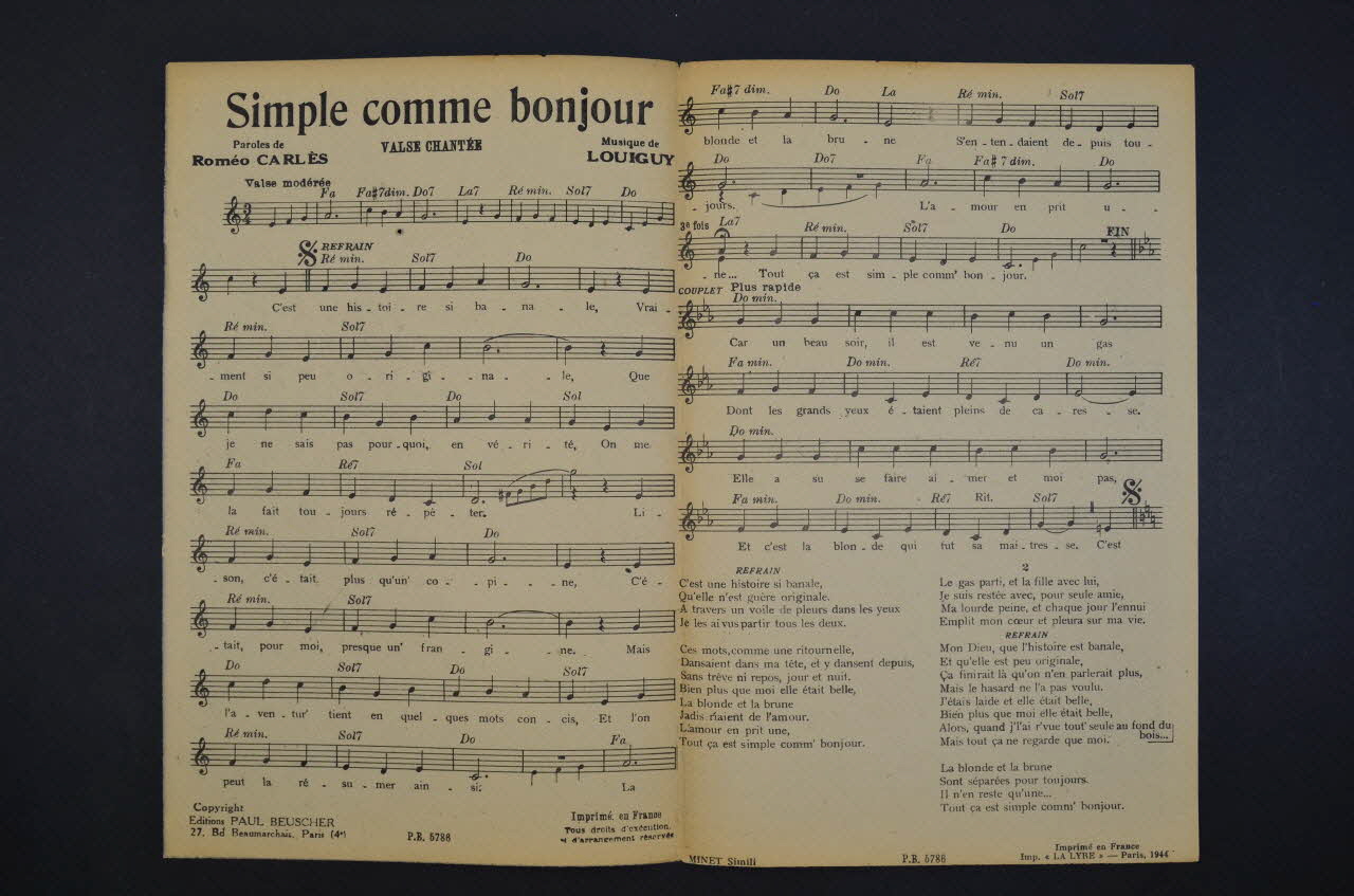 Les inscriptions renseignent le titre de la chanson, le nom des auteurs, de l'artiste et de l'éditeur. A l'intérieur, la partition et les paroles. Au dos, une liste de titres disponibles chez le même éditeur.Décor