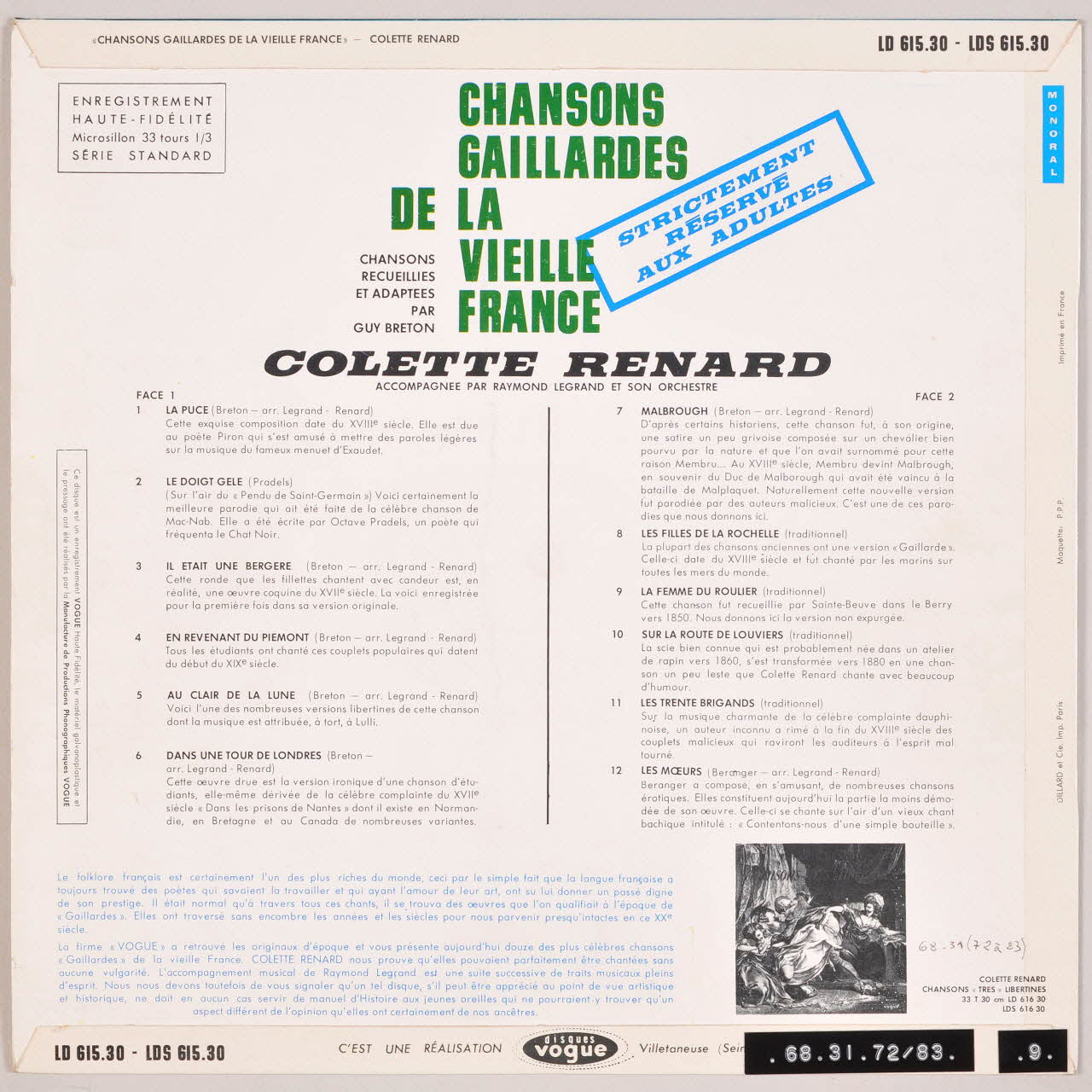 disque 33 tours, En revenant du Piémont, La femme du roulier, La puce, Au clair de la lune, Malbrough, Sur la route de Louviers, Chansons gaillardes de la vieille France, Les moeurs, Dans une tour de Londres, Le doigt gelé, Les filles de la Rochelle, Les trente brigands, Il était une bergère