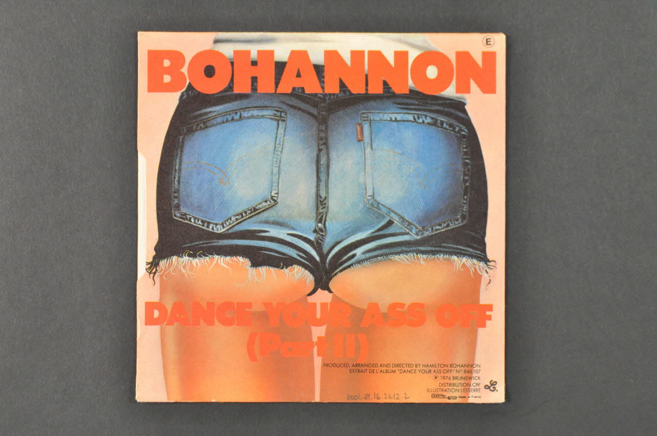 De forme carrée, la pochette est en carton, imprimée en couleur, pliée et collée. Les inscriptions sont en anglais. Au recto le fond représente, le dessin en gros plan du short en jean d'une fille de dos. En bas et en haut figurent des inscriptions en rouge. Le verso est de la même disposition que le recto.Matériaux et techniques