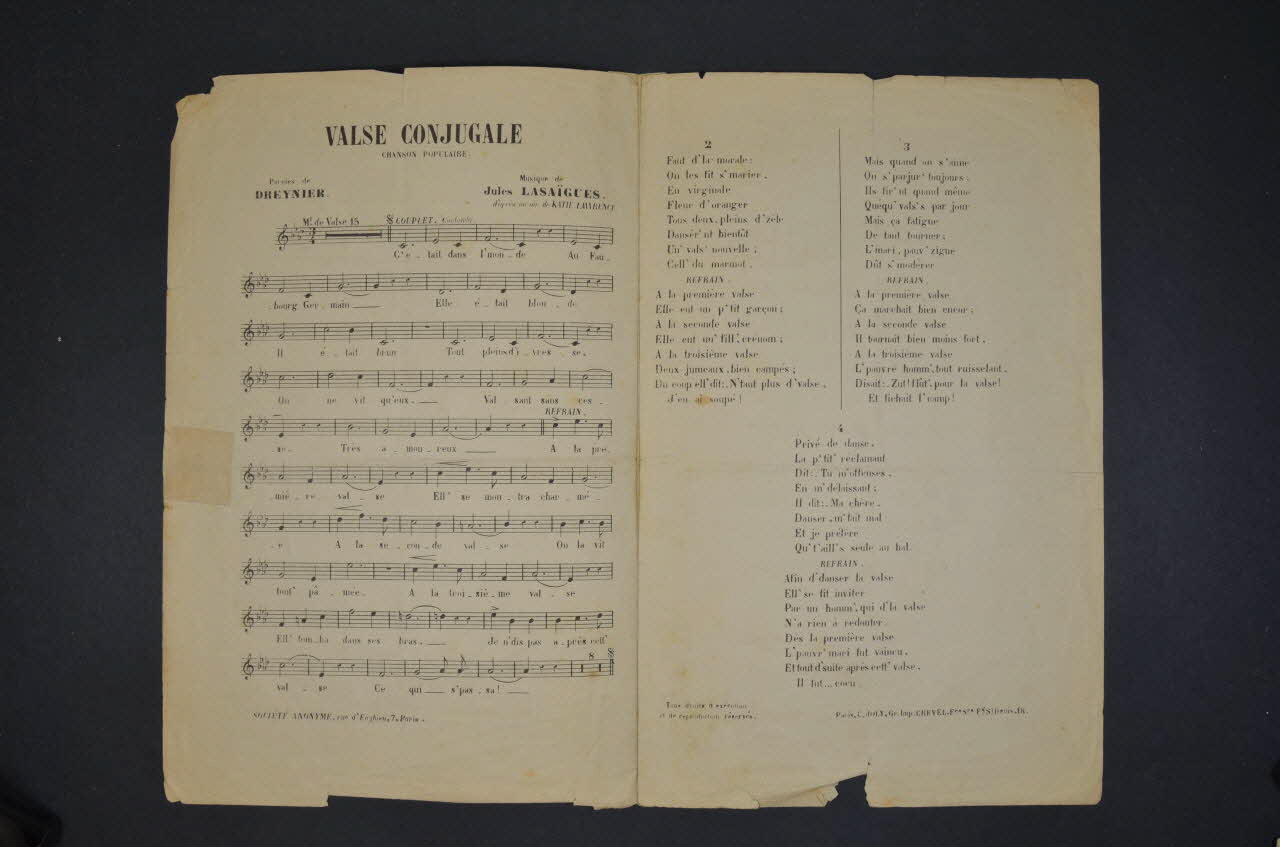Les inscriptions renseignent le titre de la chanson, le nom des auteurs, de l'artiste et de l'éditeur. A l'intérieur, partitions et paroles de la chanson. Au dos, liste d?autres partitions publiées par l?éditeur. / Au verso : arabesques, fleurs, médaillon, petits amoursDécor