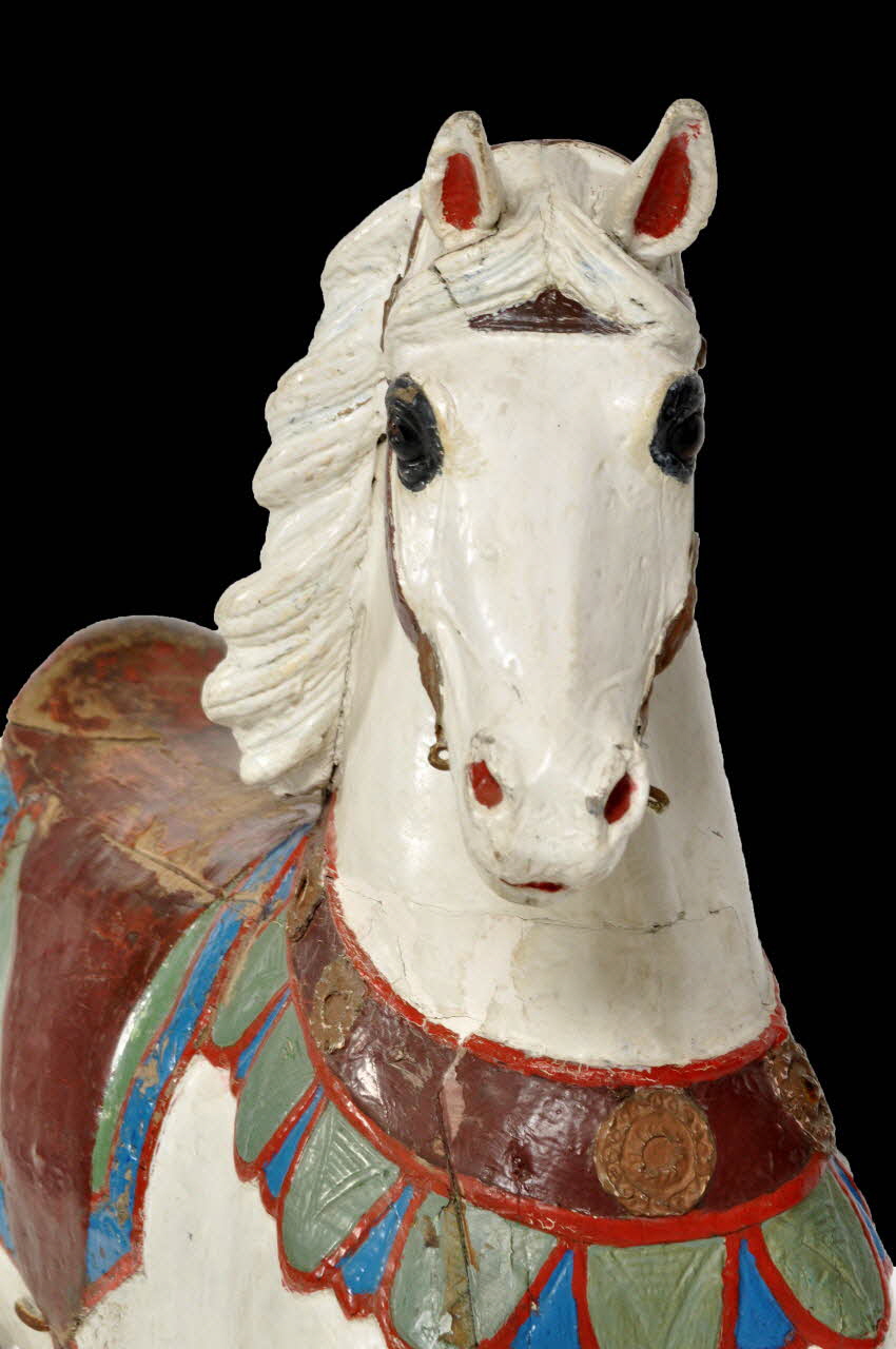 Cheval sauteur peint, à quatre pattes et crinière blanche, appartenant à un manège.