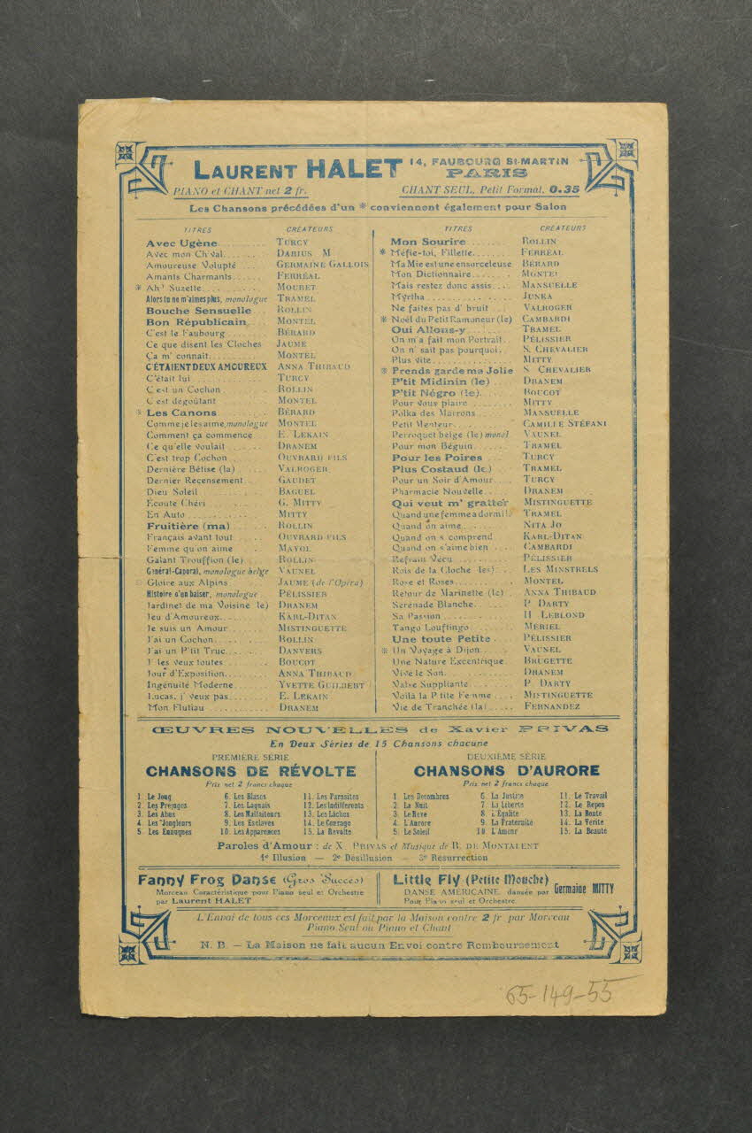 Des inscriptions renseignent le titre, les auteurs, les exécutants et l'éditeur. A l'intérieur, partition et paroles de la chanson. Au dos, liste d'autres partitions publiées par l'éditeur.Décor