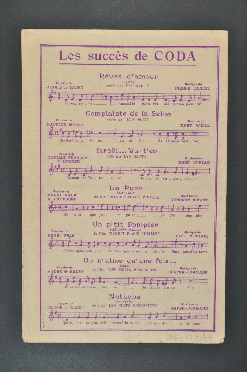 Feuillet rectangulaire en papier industriel imprimé à l'encre mauve (sauf à l'intérieur, encre noire). Sur la couverture, un portrait photographique de Lys Gauty.