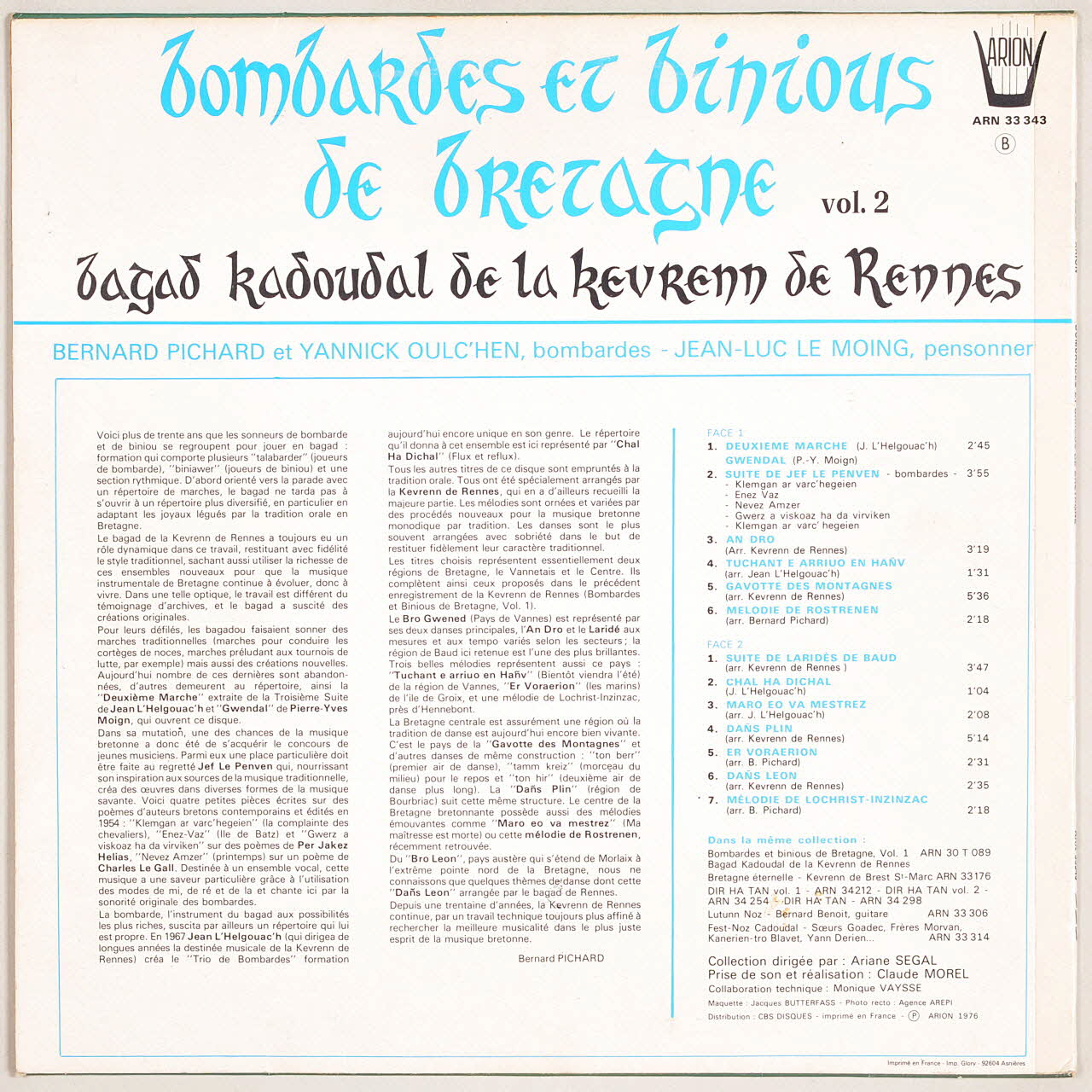 disque 33 tours, An Dro, Mélodie de Lochrist-Inzinzac, Enez Vaz, Maro éo va mestrez, Bombardes et binious de Bretagne, Dans plin, Gavotte des montagnes, Chal ha dichal, Klemgan ar varc'hegeien, Deuxième marche, Gwerz a viskoaz ha da virviken, Tuchant e arrivo en han, Mélodie de Rostrenen, Dans Léon, Suite de laridés de Baud, Nevez Amzer, Gwendal, Klemgan ar varc'hegeien, Er voraerion, Suite de Jef le Penven