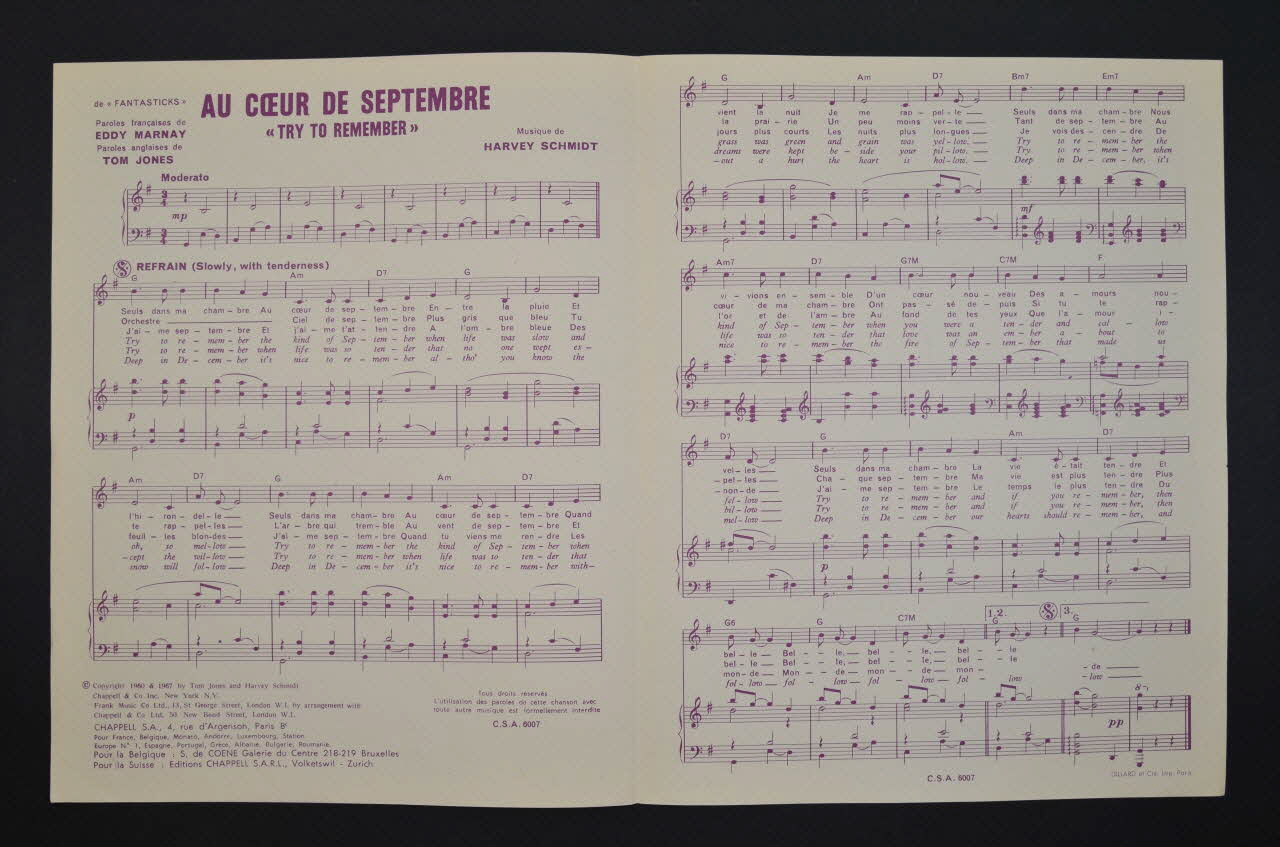 Feuillet rectangulaire en papier industriel imprimé à l'encre mauve. Sur la couverture, un portrait photographique de Nnan Mouskouri.