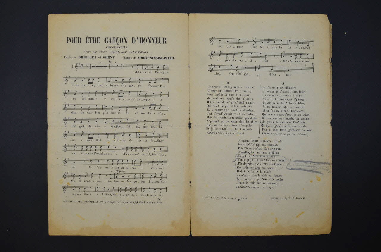 Sur la couverture, le portrait photographique de Victor lejal. Les inscriptions renseignent le titre de la chanson, le nom des auteurs, de l'artiste et de l'éditeur ; de part et d'autre du portrait, liste de chansons appartenant au répertoire de Lejal. A l'intérieur, partition et paroles de la chanson. Au dos, liste d'autres partitions publiées par l'éditeur.Matériaux et techniques
