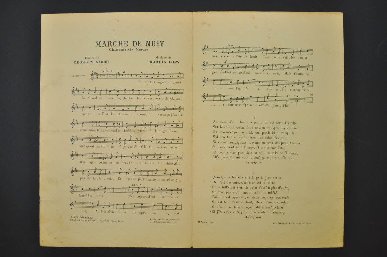 Sur la couverture, le portrait photographique, en pieds, du chanteur Vilbert en tenue militaire, les bras le long du corps. Les inscriptions renseignent le titre de la chanson, le nom des auteurs, des artistes et de l'éditeur. A l'intérieur, partition et paroles de la chanson. Au dos, liste d'autres partitions publiées par l'éditeur.Décor