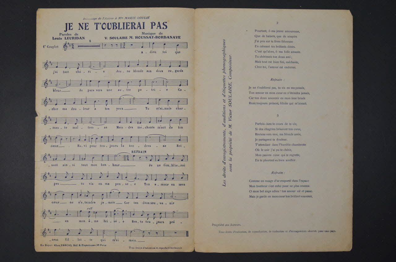 Des inscriptions renseignent le titre, les auteurs, les exécutants et l'éditeur. A l'intérieur, partition et paroles de la chanson. Au dos, liste d'autres partitions publiées par l'éditeur.Matériaux et techniques