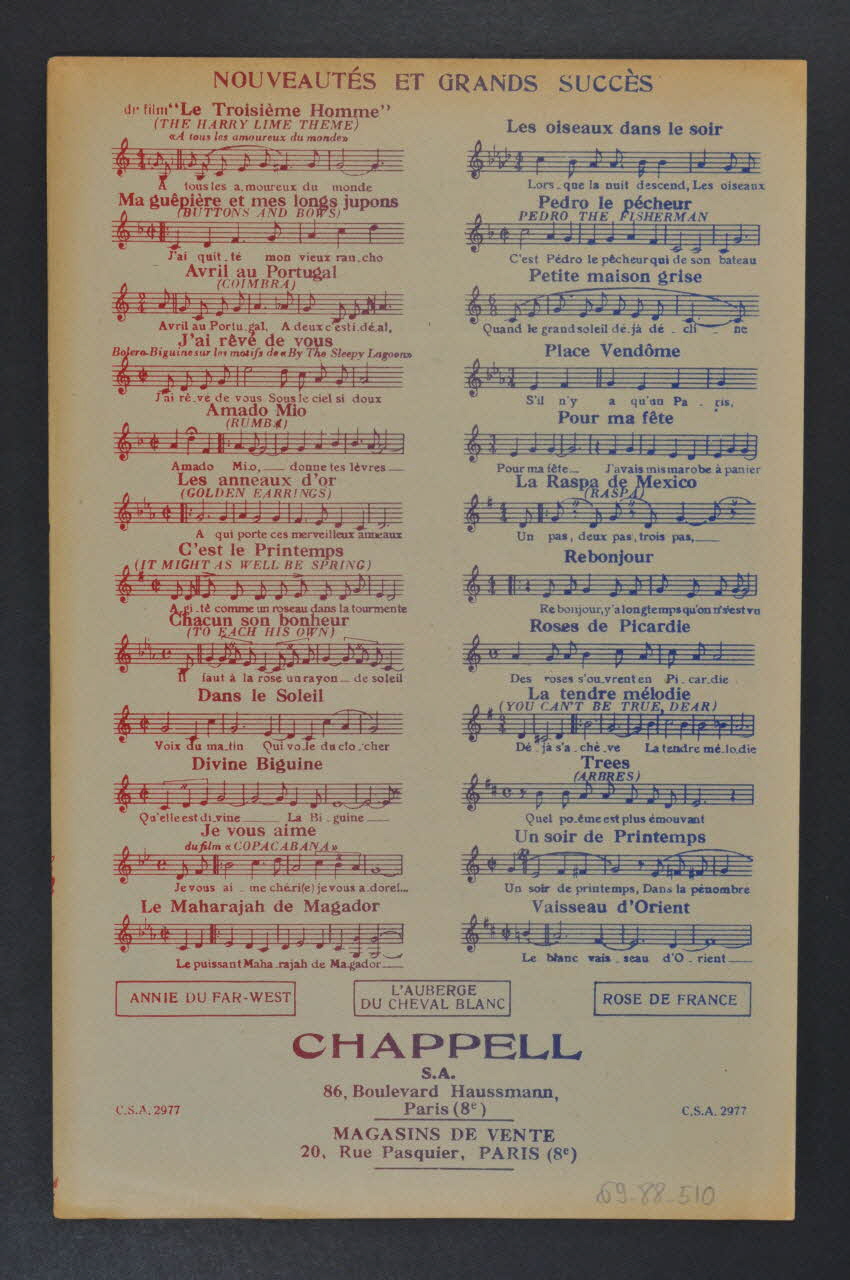 Des inscriptions renseignent le titre, les auteurs, les exécutants et l'éditeur. A l'intérieur, partition et paroles de la chanson. Au dos, liste d'autres partitions publiées par l'éditeur.Matériaux et techniques