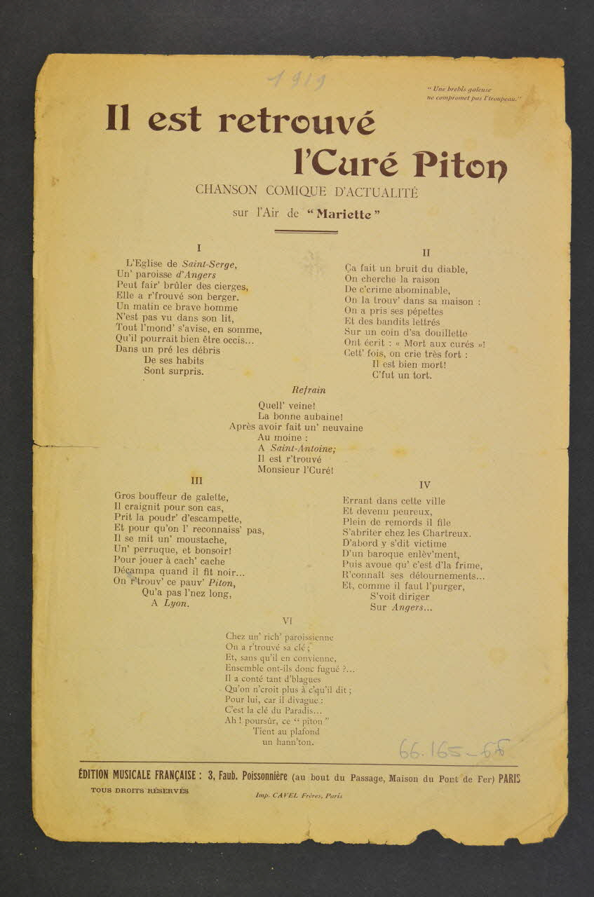 chanson, partition de musique, petit format, Il est retrouvé l'curé Piton