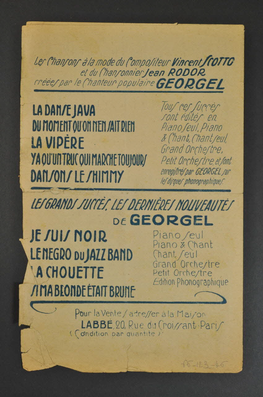 Feuillet rectangulaire en papier industriel, imprimé à l?encre bleue (sauf l?intérieur à l?encre noire). La couverture du feuillet présente la photographie de Georgel.