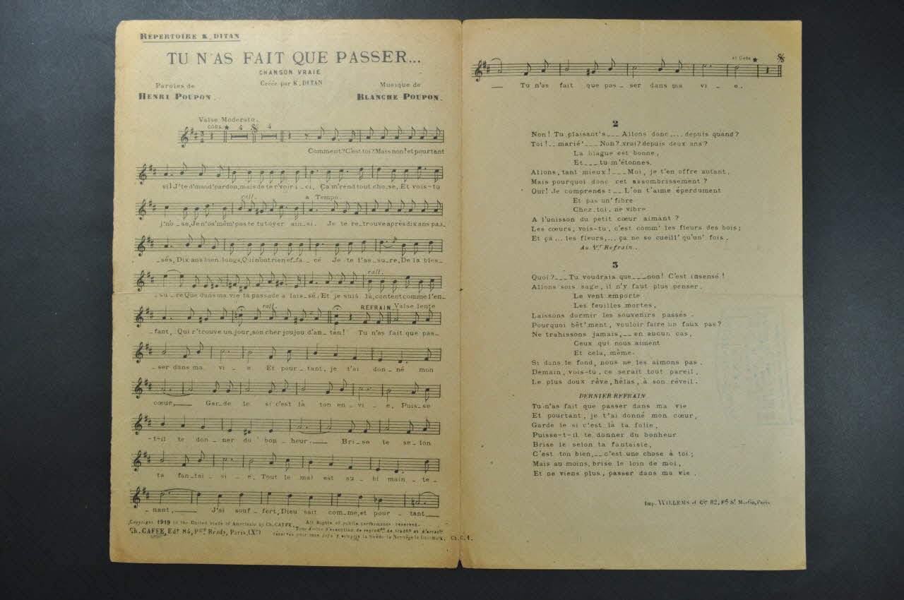 Les inscriptions renseignent le titre de la chanson, le nom des auteurs, de l'artiste et de l'éditeur. A l'intérieur, partitions et paroles de la chanson. Le dos est laissé viergeDécor