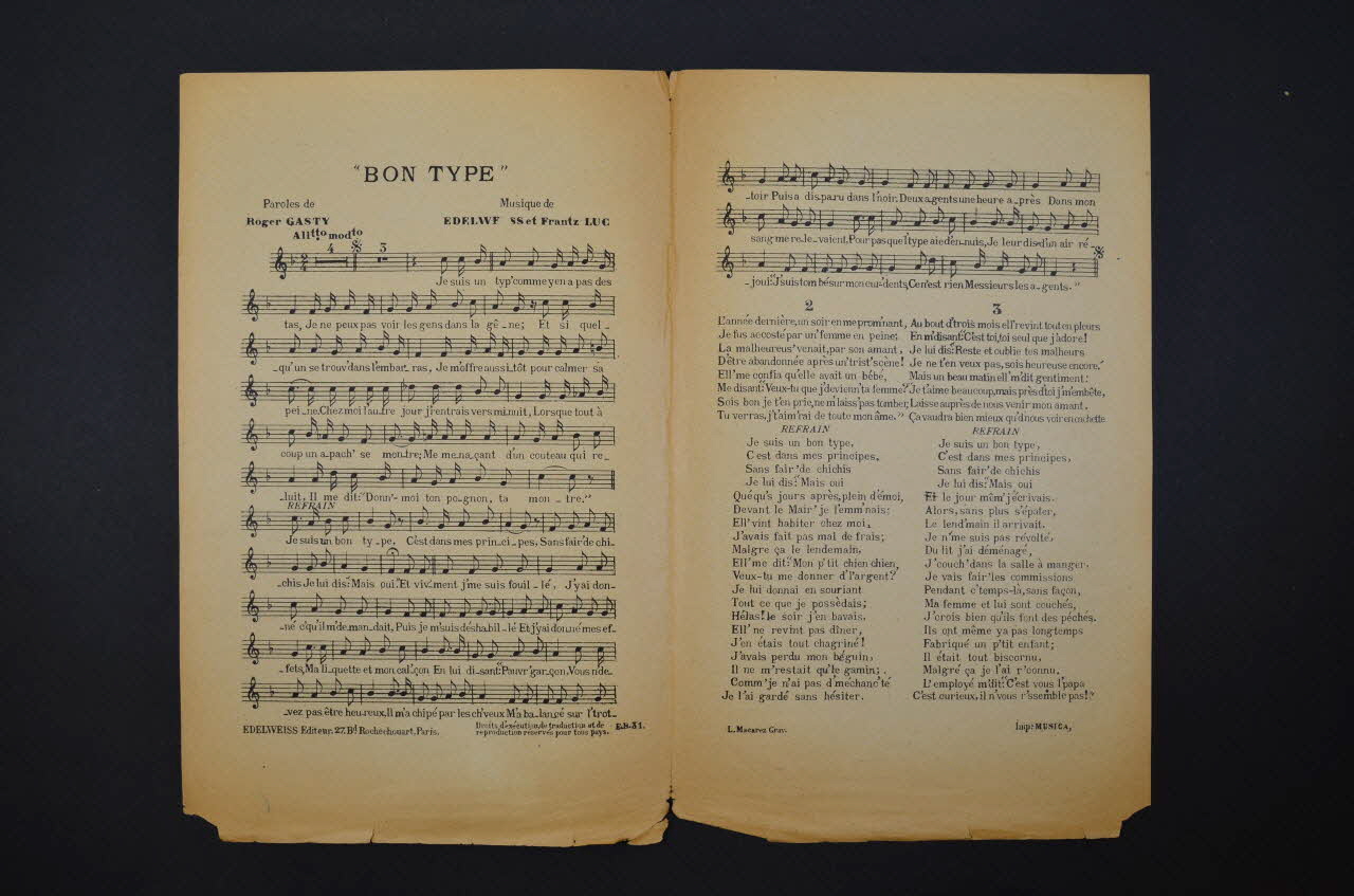 Sur la couverture, le portrait photographique en pieds de Balard, en costume de clown, et représentation caricaturale de Joanny coiffé d'un canotier. Les inscriptions renseignent le titre de la chanson, le nom des auteurs, de l'artiste et de l'éditeur. A l'intérieur, partition et paroles de la chanson. Le dos est laissé vierge.Décor
