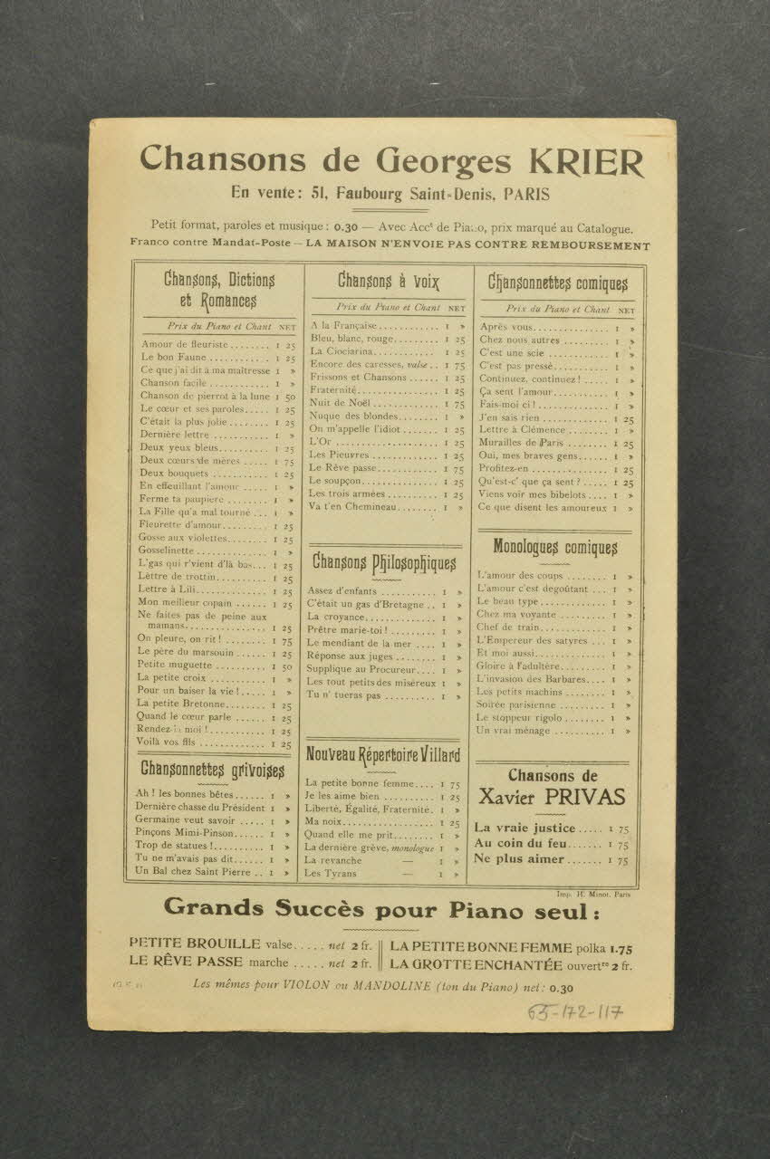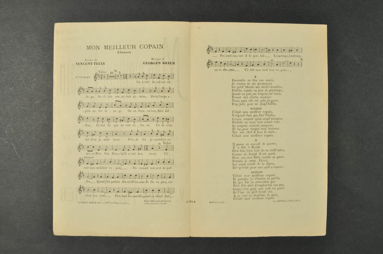 A l'intérieur, partition et paroles de la chanson. Au dos, liste d'autres partitions publiées par l'éditeur.Matériaux et techniques