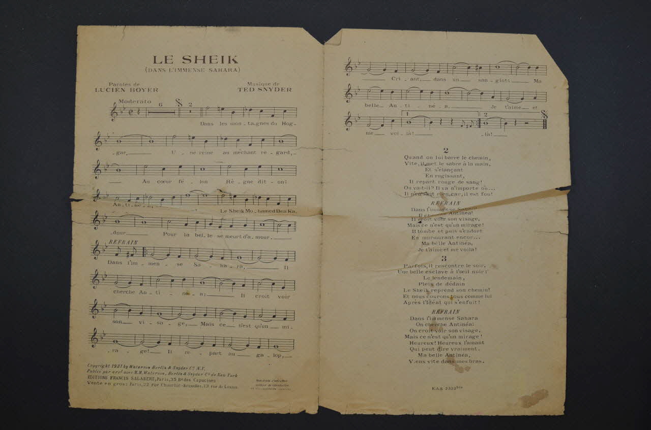 Sur la couverture, dans la partie basse, les portraits photographiques en médaillon de Jean Flor et de Jacques Vitry ; au-dessus, représentation d'un sheik tenant dans ses bras une jeune femme avec coiffure orientale. Les inscriptions renseignent le titre de la chanson, le nom des auteurs, des artistes et de l'éditeur. A l'intérieur, partition et paroles de la chanson. Au dos, liste d'autres partitions publiées par l'éditeur.Décor