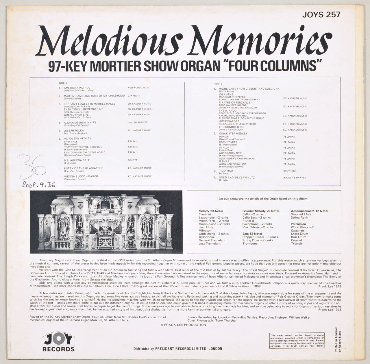 disque 33 tours, Avalon, Down yonder, Pirates of Penzance, When other lips, A wand'ring ministrel I, Melodious Memories, Highlights from Gilbert and Sullivan, Iolanthe, The gondoliers, Vienna blood, Behold the Lord High Executioner, Flowers that bloom in the spring, Hms pinafore, Malaguena, Loudly let the trumpets bray, The mikado, Al Jolson medley, Margie, Alexander's Ragtime Band, Baby face, Poor wandering one, When a felon's not engaged, I'm sitting on top of the world, I'm called little buttercup, The you'll remember me, Dance a cachucha, American patrol, When you're smilin', Joseph polka, Toot toot tootsie, Entry of the gladiators, Aquarius, Gold and silver waltz, Marta, rambling rose of my childhood, Who's sorry now, Tico-Tico, March of the peers, I dreamt I dwelt in marble halls