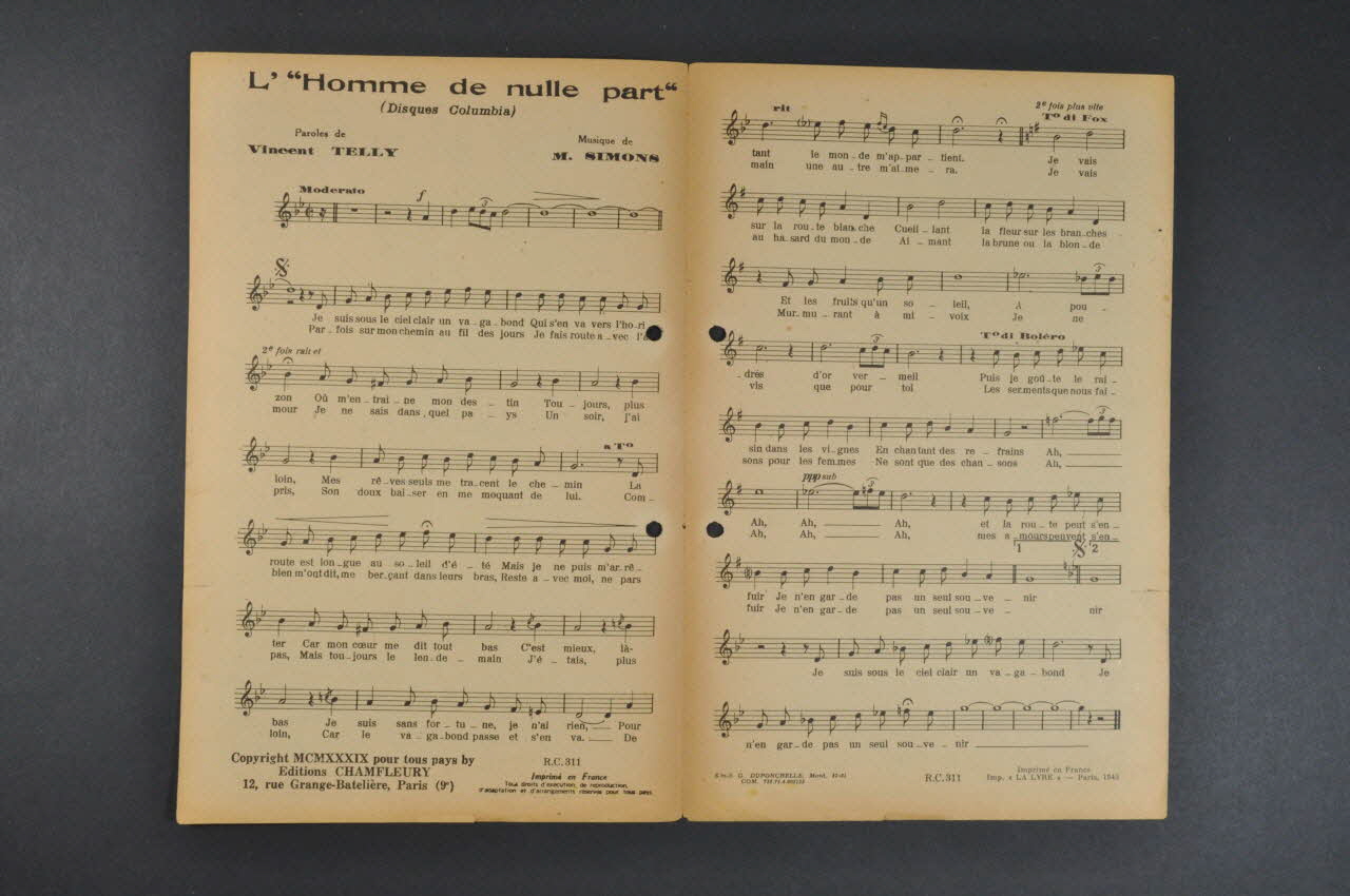 La première page présente la photographie de Georges Guétary. Les inscriptions précisent le titre de la chanson, l'auteur et l'éditeur. A l'intérieur se trouvent la partition et les paroles de la chanson. Au dos se trouve une liste des morceaux disponibles chez le même éditeur. Le feuillet est perforé en deux endroits près de la tranche.Matériaux et techniques