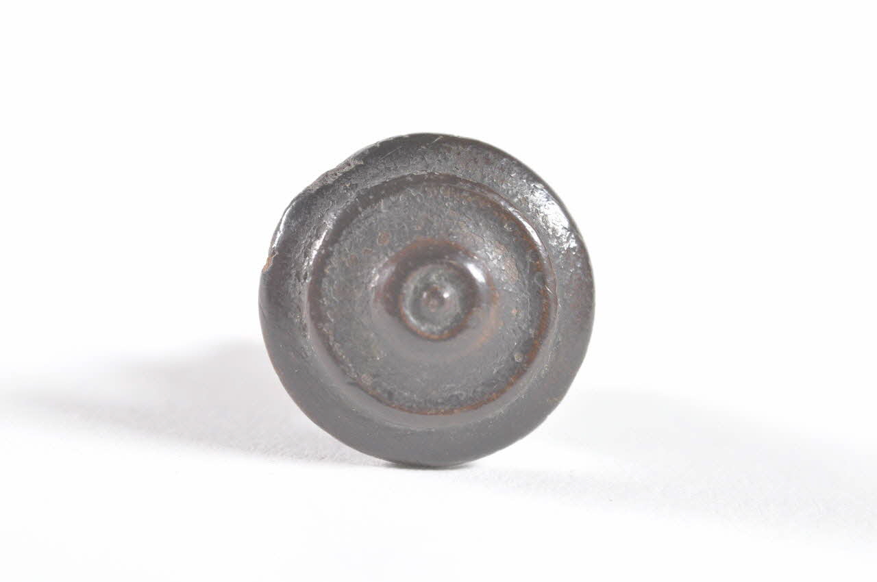 Poignée du tiroir en bois tourné, à bouton circulaire vernis, présentant des décors de cercles concentriques. / Trébuchet (balance de précision d'orfèvre?) : tiroirMatériaux et techniques