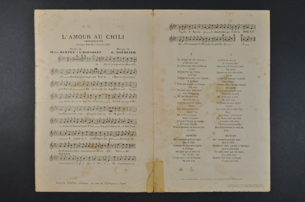 Sur la couverture, représentation d'une femme nue, avec ceinture de cauris, coquillages aux oreilles, gants et chapeau à larges bordes traversé de deux fleurets ; à l'arrière-plan, mer et palmier, à droite, Tour Eiffel à gauche. Les inscriptions renseignent le titre de la chanson, le nom des auteurs, de l'artiste et de l'éditeur. A l'intérieur, partition et paroles de la chanson. Au dos, liste d'autres partitions publiées par l'éditeur.Inscriptions
