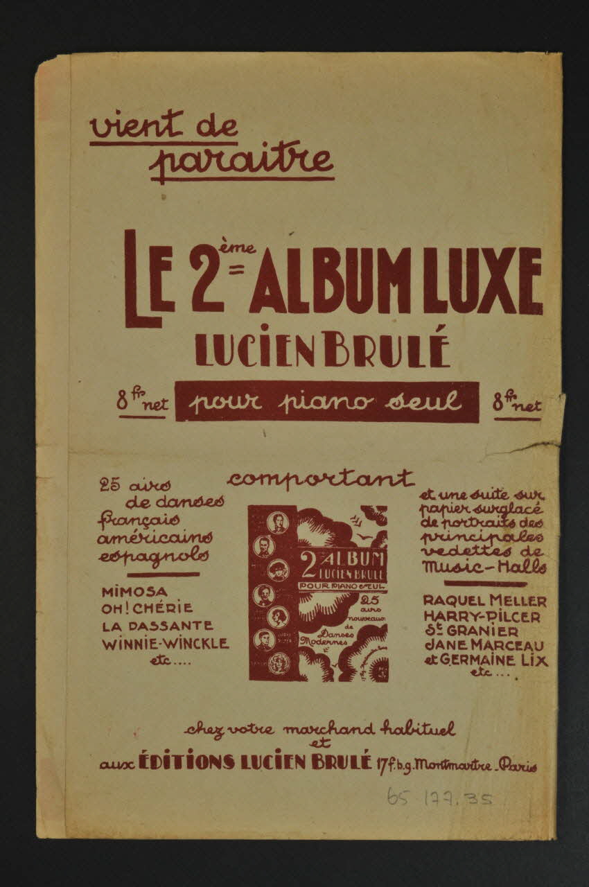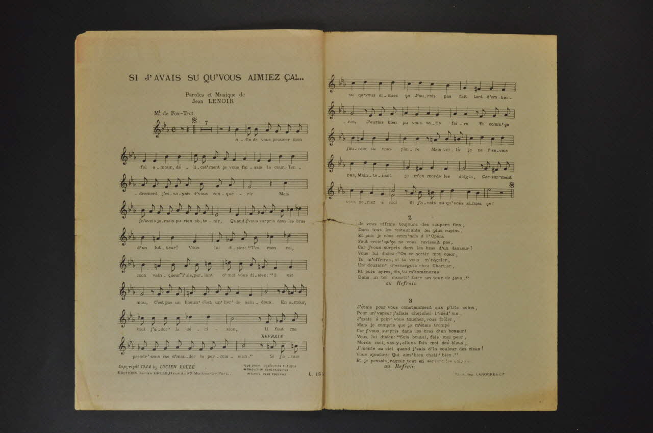 Les inscriptions renseignent le titre de la chanson, le nom des auteurs, de l'artiste et de l'éditeur. A l'intérieur, partitions et paroles de la chanson. Au dos, liste d?autres partitions publiées par l?éditeur.Décor