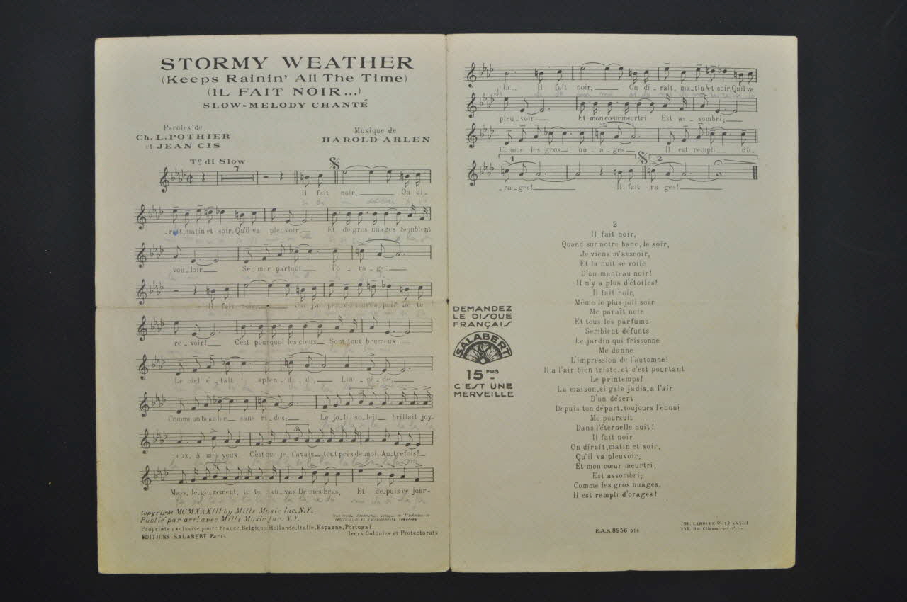 Sur la couverture, représentation d'un visage de femme de profil, en silhouette. Les inscriptions renseignent le titre de la chanson, le nom des auteurs, de l'artiste et de l'éditeur. A l'intérieur, partition et paroles de la chanson. Au dos, liste d'autres partitions publiées par l'éditeur.Décor