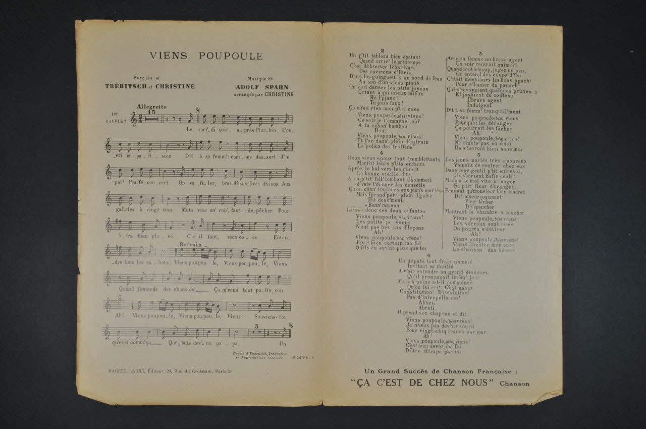 Des inscriptions renseignent le titre, les auteurs, les exécutants et l'éditeur. A l'intérieur, partition et paroles de la chanson. Au dos, liste d'autres partitions publiées par l'éditeur.Matériaux et techniques